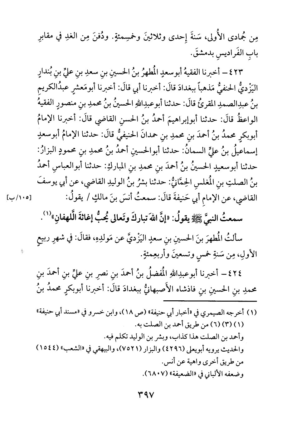 423 - أخبرنا الفقيهُ أبو سعدٍ المُطهرُ بنُ الحسينِ بنِ سعدِ بنِ عليِّ بنِ بُندارٍ اليَزْديُّ الحنفيُّ مَذهباً ببغدادَ قالَ: أخبرنا أبي قالَ: أخبرنا أبو مَعشرٍ عبدُ الكريمِ بنُ عبدِ الصمدِ المقرئُ قالَ: حدثنا أبو عبدِ اللهِ الحسينُ بنُ محمدِ بنِ منصورٍ الفقيهُ الواعظُ قالَ: حدثنا أبو إبراهيمَ أحمدُ بنُ الحسنِ القاضي قالَ: أخبرنا الإمامُ أبو بكرٍ محمدُ بنُ أحمدَ بنِ محمدِ بنِ حمدانَ الحنيفيُّ قالَ: حدثنا الإمامُ أبو سعدٍ إسماعيلُ بنُ عليٍّ السمانُ: حدثنا أبو الحسينِ أحمدُ بنُ محمدِ بنِ محمودٍ البزارُ: حدثنا أبو سعيدٍ الحسينُ بنُ أحمدَ بنِ محمدِ بنِ المباركِ: حدثنا أبو العباسِ أحمدُ بنُ الصلتِ بنِ المُغلسِ الحِمَّانيُّ: حدثنا بشرُ بنُ الوليدِ القاضي، عن أبي يوسفَ القاضي، عن الإمامِ أبي حَنيفةَ قالَ: سمعتُ أنسَ بنَ مالكٍ / يقولُ: