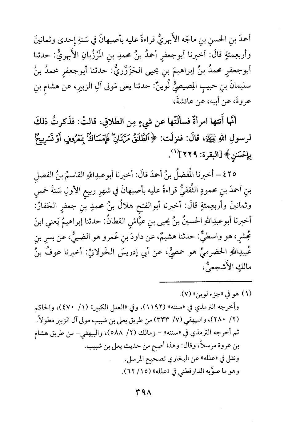 أنَّها أَتتها امرأةٌ فسألَتْها عن شيءٍ مِن الطلاقِ، قالتْ: فذَكرتُ ذلكَ لرسولِ اللهِ صلى الله عليه وسلم، قالَ: فنزلَت: {الطَّلَاقُ مَرَّتَانِ فَإِمْسَاكٌ بِمَعْرُوفٍ أَوْ تَسْرِيحٌ بِإِحْسَانٍ} [البقرة: 229] (¬1).
