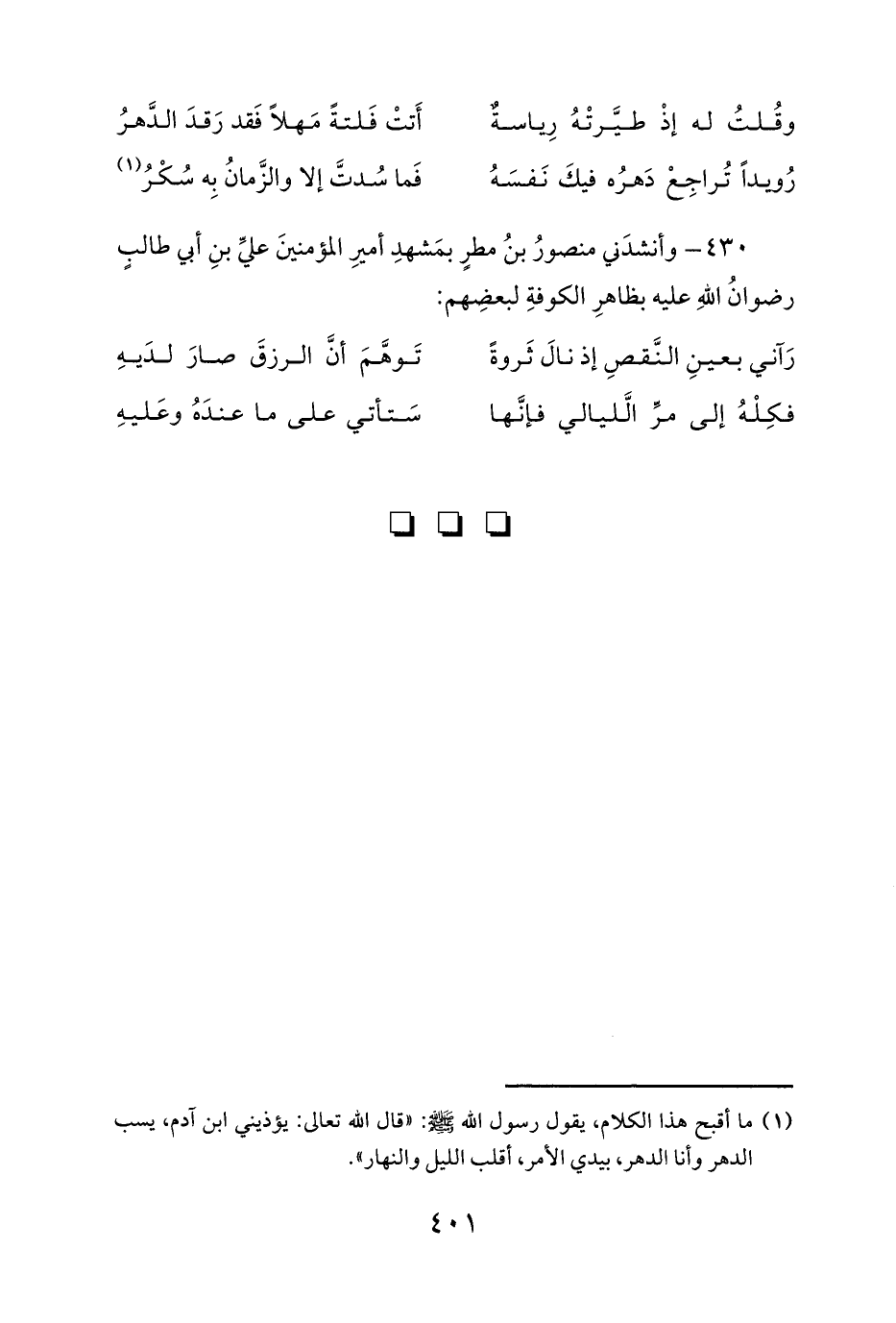 430 - وأنشدَني منصورُ بنُ مطرٍ بمَشهدِ أميرِ المؤمنينَ عليِّ بنِ أبي طالبٍ رضوانُ اللهِ عليه بظاهرِ الكوفةِ لبعضِهم:
