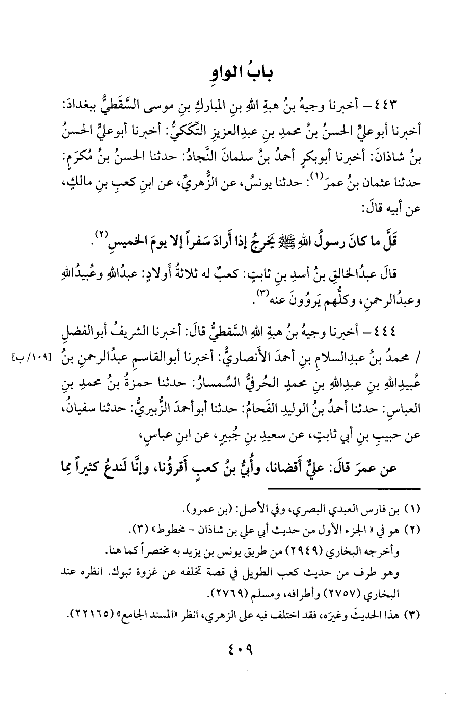 443 - أخبرنا وجيهُ بنُ هبةِ اللهِ بنِ المباركِ بنِ موسى السَّقَطيُّ ببغدادَ: أخبرنا أبو عليٍّ الحسنُ بنُ محمدِ بنِ عبدِ العزيزِ التِّكَكيُّ: أخبرنا أبو عليٍّ الحسنُ بنُ شاذانَ: أخبرنا أبو بكرٍ أحمدُ بنُ سلمانَ النَّجادُ: حدثنا الحسنُ بنُ مُكرَمٍ: حدثنا عثمان بنُ عمرَ (¬1): حدثنا يونسُ، عن الزُّهريِّ، عن ابنِ كعبِ بنِ مالكٍ، عن أبيه قالَ:
