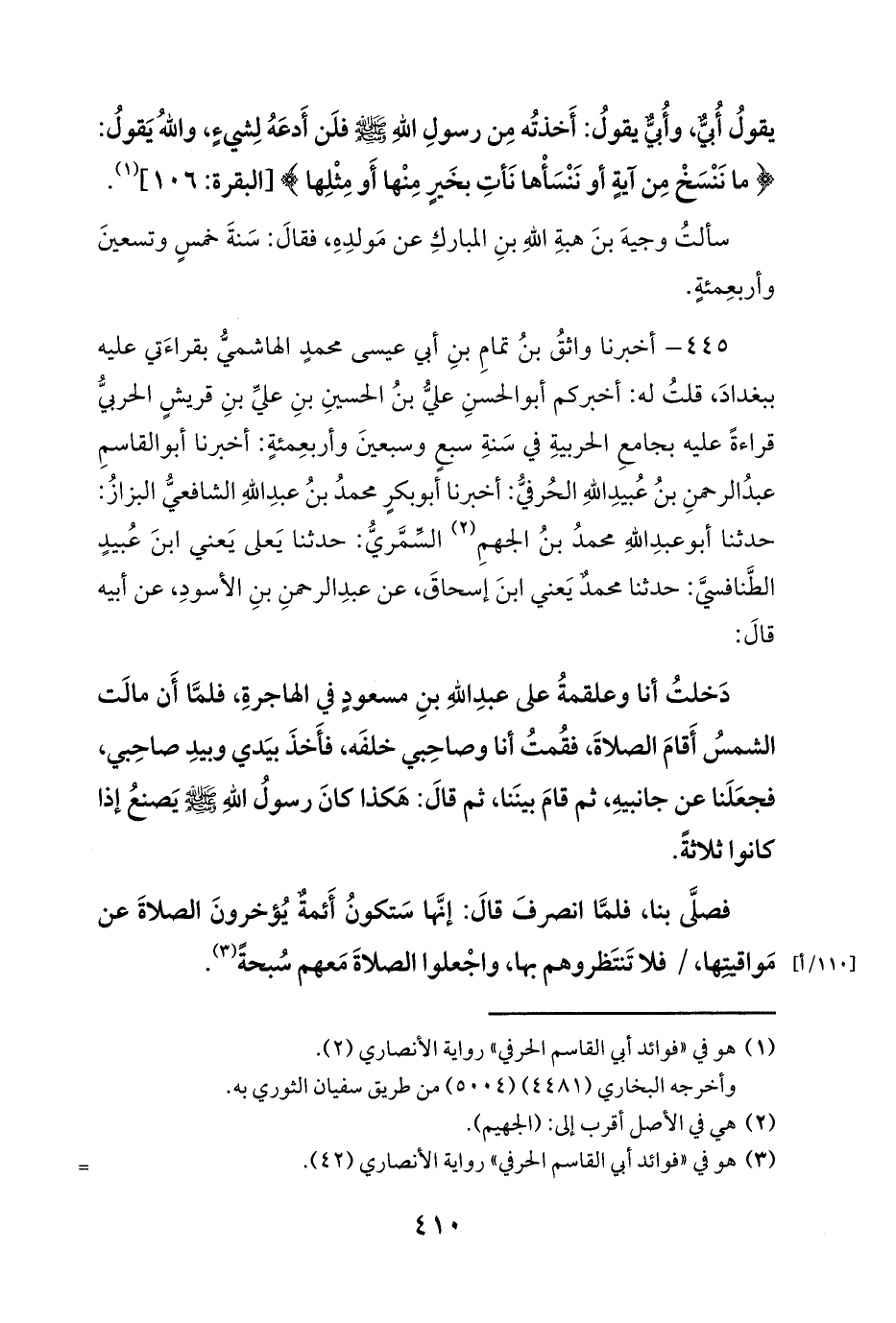 445 - أخبرنا واثقُ بنُ تمامِ بنِ أبي عيسى محمدٍ الهاشميُّ بقراءَتي عليه ببغدادَ، قلتُ له: أخبركم أبو الحسنِ عليُّ بنُ الحسينِ بنِ عليِّ بنِ قريشٍ الحربيُّ قراءةً عليه بجامعِ الحربيةِ في سَنةِ سبعٍ وسبعينَ وأربعِمئةٍ: أخبرنا أبو القاسمِ عبدُ الرحمنِ بنُ عُبيدِ اللهِ الحُرفيُّ: أخبرنا أبو بكرٍ محمدُ بنُ عبدِ اللهِ الشافعيُّ البزازُ: حدثنا أبو عبدِ اللهِ محمدُ بنُ الجهمِ (¬2) السِّمَّريُّ: حدثنا يَعلى يَعني ابنَ عُبيدٍ الطَّنافسيَّ: حدثنا محمدٌ يَعني ابنَ إسحاقَ، عن عبدِ الرحمنِ بنِ الأسودِ، عن أبيه قالَ: