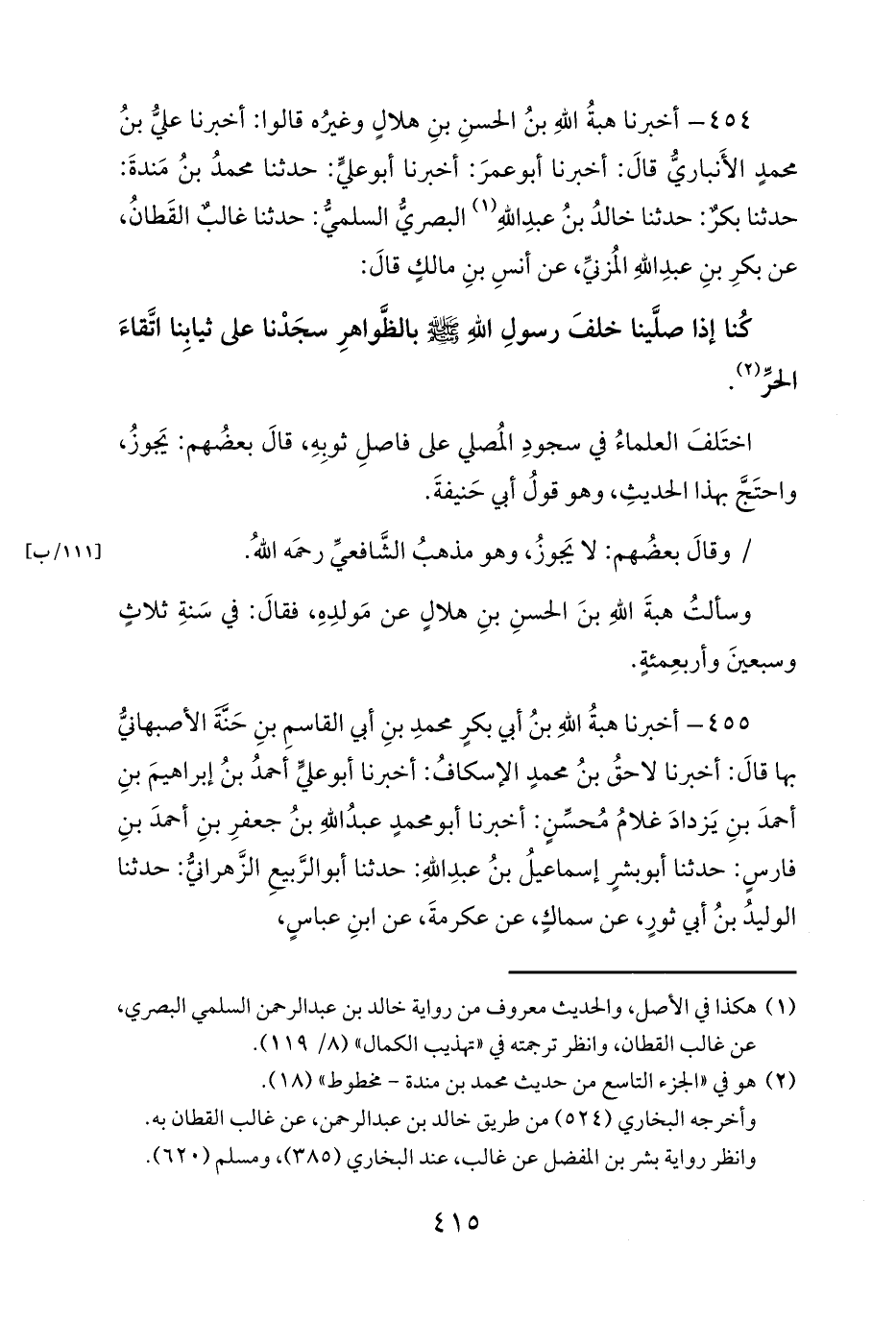 454 - أخبرنا هبةُ اللهِ بنُ الحسنِ بنِ هلالٍ وغيرُه قالوا: أخبرنا عليُّ بنُ محمدٍ الأَنباريُّ قالَ: أخبرنا أبو عمرَ: أخبرنا أبو عليٍّ: حدثنا محمدُ بنُ مَندةَ: حدثنا بكرٌ: حدثنا خالدُ بنُ عبدِ اللهِ (¬1) البصريُّ السلميُّ: حدثنا غالبٌ القَطانُ، عن بكرِ بنِ عبدِ اللهِ المُزنيِّ، عن أنسِ بنِ مالكٍ قالَ: