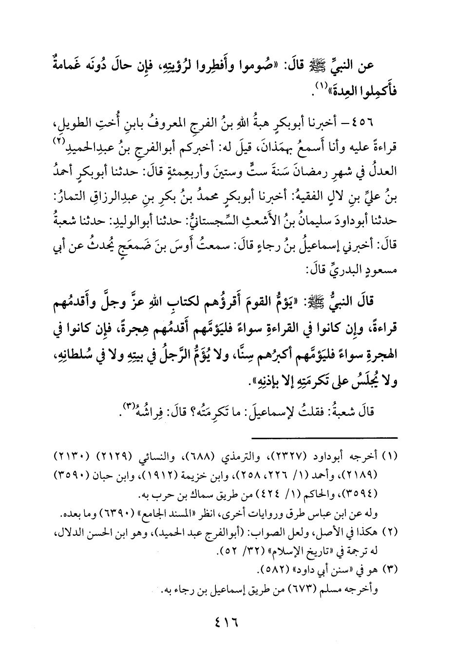 456 - أخبرنا أبو بكرٍ هبةُ اللهِ بنُ الفرجِ المعروفُ بابنِ أُختِ الطويلِ، قراءةً عليه وأنا أَسمعُ بهمَذانَ، قيلَ له: أخبركم أبو الفرجِ بنُ عبدِ الحميدِ (¬2) العدلُ في شهرِ رمضانَ سَنةَ ستٍّ وستينَ وأربعِمئةٍ قالَ: حدثنا أبو بكرٍ أحمدُ بنُ عليِّ بنِ لالٍ الفقيهُ: أخبرنا أبو بكرٍ محمدُ بنُ بكرِ بنِ عبدِ الرزاقِ التمارُ: حدثنا أبو داودَ سليمانُ بنُ الأَشعثِ السِّجستانيُّ: حدثنا أبو الوليدِ: حدثنا شعبةُ قالَ: أخبرني إسماعيلُ بنُ رجاءٍ قالَ: سمعتُ أَوسَ بنَ ضَمعَجٍ يُحدثُ عن أبي مسعودٍ البدريِّ قالَ: