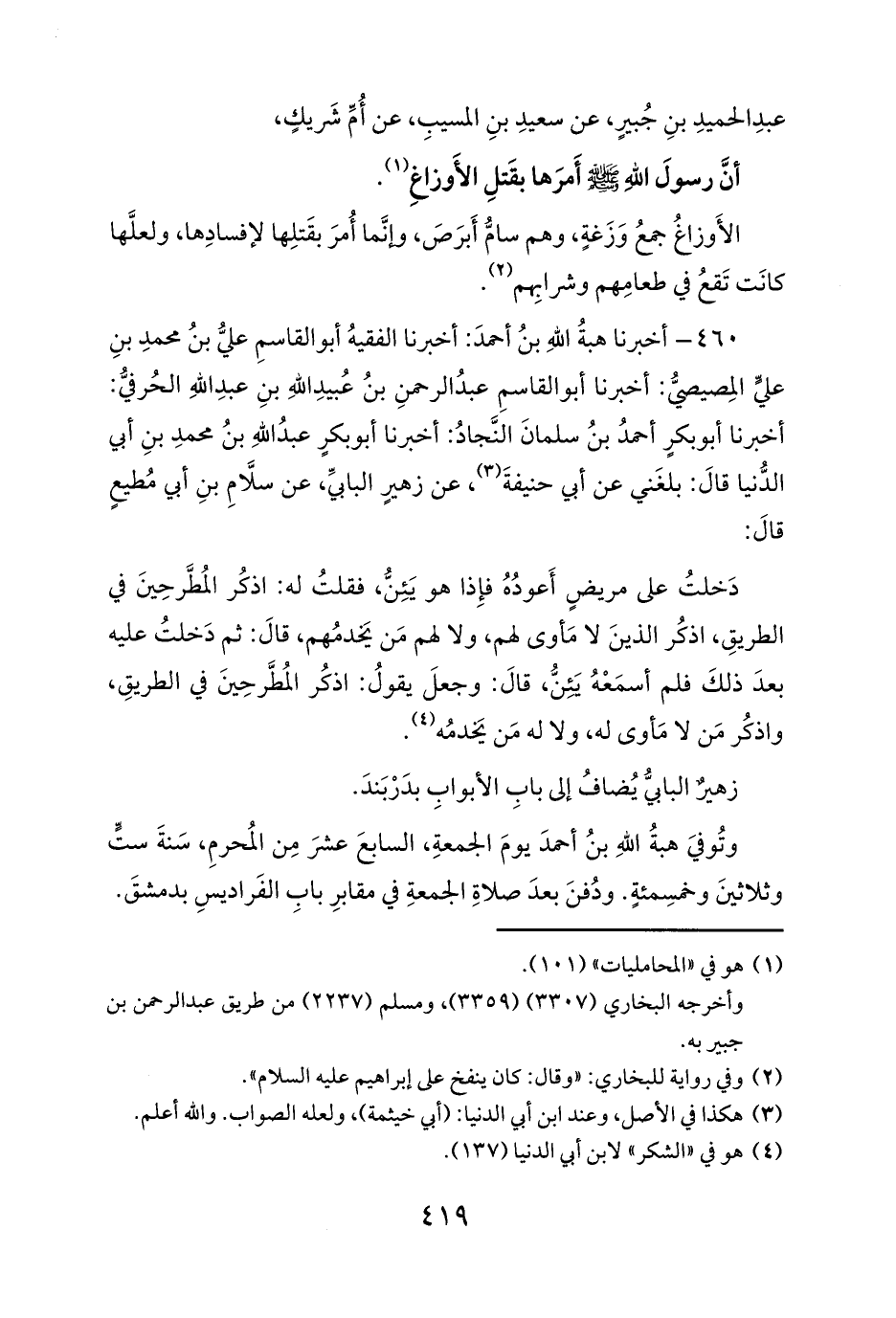 460 - أخبرنا هبةُ اللهِ بنُ أحمدَ: أخبرنا الفقيهُ أبو القاسمِ عليُّ بنُ محمدِ بنِ عليٍّ المِصيصيُّ: أخبرنا أبو القاسمِ عبدُ الرحمنِ بنُ عُبيدِ اللهِ بنِ عبدِ اللهِ الحُرفيُّ: أخبرنا أبو بكرٍ أحمدُ بنُ سلمانَ النَّجادُ: أخبرنا أبو بكرٍ عبدُ اللهِ بنُ محمدِ بنِ أبي الدُّنيا قالَ: بلغَني عن أبي حنيفةَ (¬3)، عن زهيرٍ البابيِّ، عن سلَّامِ بنِ أبي مُطيعٍ قالَ: