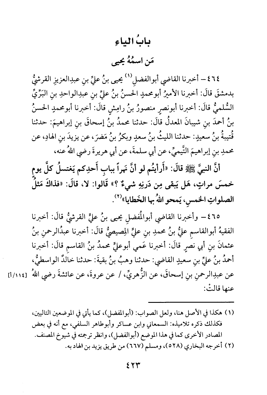 465 - وأخبرنا القاضي أبو المُفضلِ يحيى بنُ عليٍّ القرشيُّ قالَ: أخبرنا الفقيهُ أبو القاسمِ عليُّ بنُ محمدِ بنِ عليٍّ المِصيصيُّ قالَ: أخبرنا عبدُ الرحمنِ بنُ عثمانَ بنِ أبي نصرٍ قالَ: أخبرنا عَمي أبو عليٍّ محمدُ بنُ القاسمِ قالَ: أخبرنا أحمدُ بنُ عليِّ بنِ سعيدٍ القاضي: حدثنا وهبُ بنُ بقيةَ: حدثنا خالدٌ الواسطيُّ، عن عبدِ الرحمنِ بنِ إسحاقَ، عن الزُّهريِّ، / عن عروةَ، عن عائشةَ رضي اللهُ عنها قالتْ: