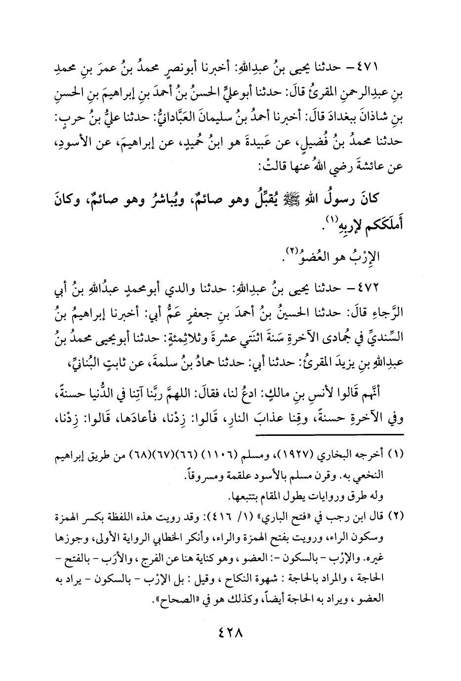 (¬2) قال ابن رجب في «فتح الباري» (1/ 416): وقد رويت هذه اللفظة بكسر الهمزة وسكون الراء، ورويت بفتح الهمزة والراء، وأنكر الخطابي الرواية الأولى، وجوزها غيره. والإرْب - بالسكون -: العضو، وهو كناية هنا عن الفرج، والأرَب - بالفتح - الحاجة، والمراد بالحاجة: شهوة النكاح، وقيل: بل الإرْب - بالسكون - يراد به العضو، ويراد به الحاجة أيضاً، وكذلك هو في «الصحاح».