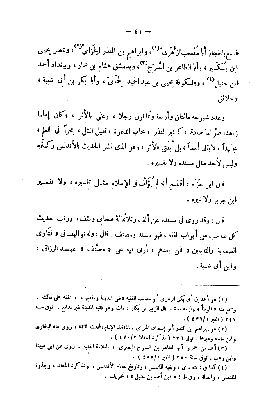 وعدد شيوخه مائتان وأربعة وثمانون رجلاً، وعنى بالأثر، وكان إماماً زاهداً صواماً صادقاً، كثير النذر، مجاب الدعوة، قليل المثل، بحراً في العلم، مجتهداً، لا يقلد أحداً، بل يفتي بالأثر، وهوالذي نشر الحديث بالأندلس وكثره وليس لأحد مثل مسنده ولا تفسيره.