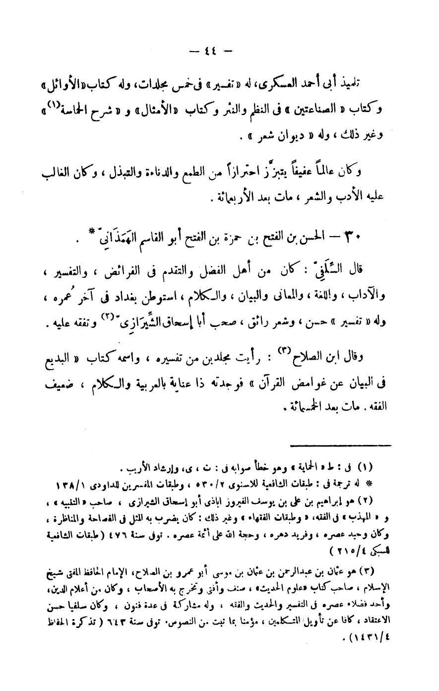 وقال ابن الصلاح: رأيت مجلدين من تفسيره، واسمه كتاب البديع في البيان عن غوامض القرآن فوجدته ذا عناية بالعربية والكلام، ضعيف الفقه.