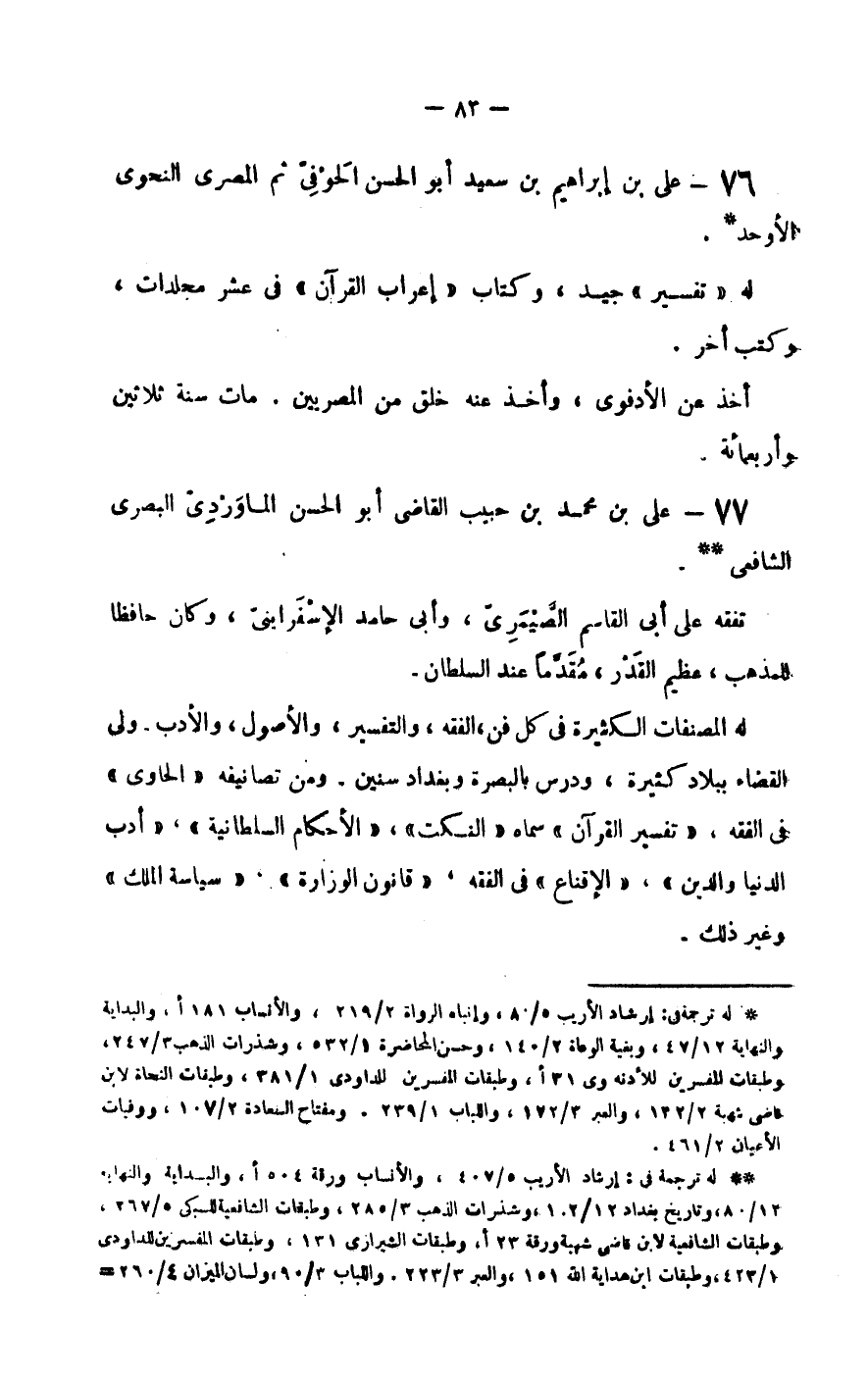 له المصنفات الكثيرة في كل فن، الفقه، والتفسير، والأصول، والأدب - ولي القضاء ببلاد كثيرة، ودرس بالبصرة وبغداد سنين - ومن تصانيفه الحاوي في الفقه، تفسير القرآن سماه النكت، الأحكام السلطانية، أدب الدنيا والدين، الإقناع في الفقه، قانون الوزارة، سياسة الملك وغير ذلك.