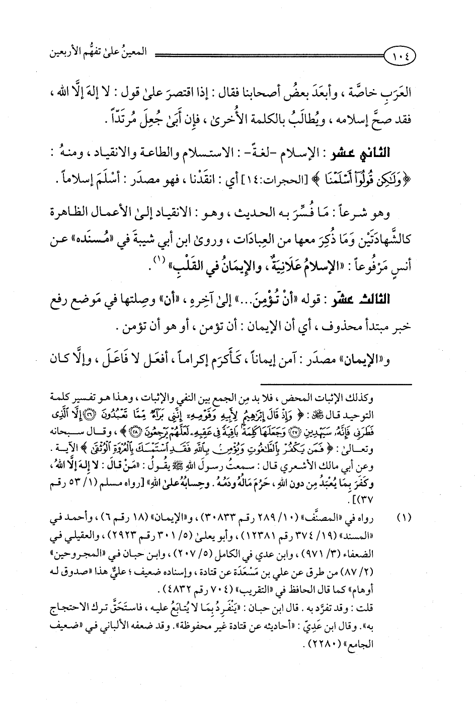 الثاني عشر: الإسلام -لغة-: الاستسلام والطاعة والانقياد، ومنهُ: {وَلَكِنْ قُولُوا أَسْلَمْنَا} [الحجرات: 14]، أي: انقَدْنا، فهو مصدَر: أسْلَمَ إسلامًا.