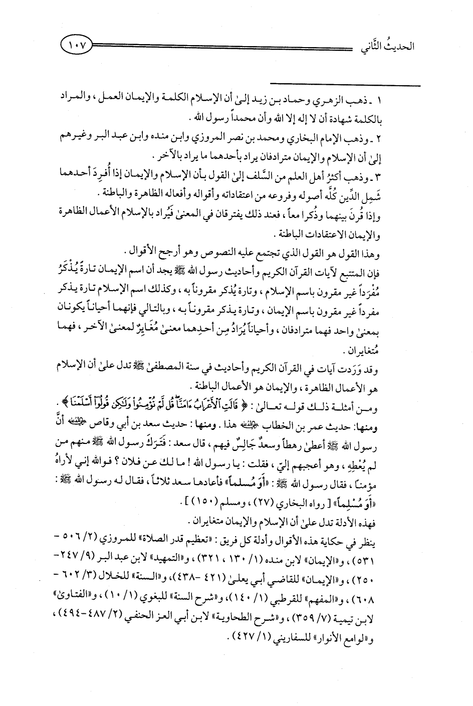 = 1 - ذهب الزهري وحماد بن زيد إلي أن الإسلام الكلمة والإيمان العمل، والمراد بالكلمة شهادة أن لا إله إلا الله وأن محمدًا رسول الله.