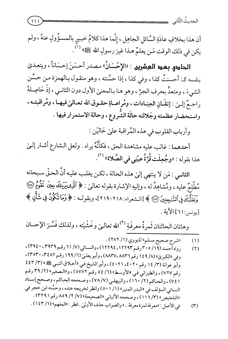 الحاي بعد العشرين: "الإِحْسَانُ" مصدر أحسَنَ إحسَانًا، ويتعدى بنفسه كـ: أحسنتُ كذا، وفي كذا، إذا حسَّنته، وهو منقول بالهمزة من حسَّن الشيءَ، ومتعدٍّ بحرف الجرِّ، وهو هنا بالمعنى الأول دون الثاني، إذْ حَاصِلهُ راجعٌ إلى: إتقَانِ العِبَادات، ومُراعاةِ حقوق الله تعالى فيها، ومُراقبته، واستحضار عظمته وجَلالته حالَة الشُروع، وحالة الاستمرار فيها.