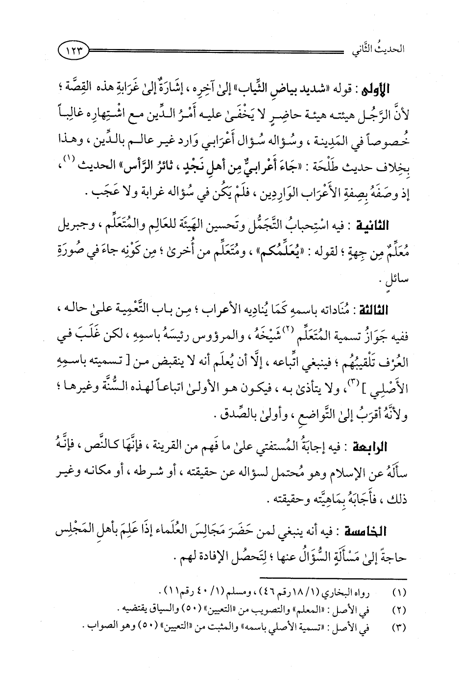 الثانية: فيه اسْتِحبابُ التَّجَمُّل وتَحسين الهَيئَة للعَالِم والمُتَعَلِّم، وجبريل مُعَلِّم مِن جِهةٍ، لقوله: "يُعَلِّمُكم"، ومُتَعَلِّم من أُخرى، مِن كَوْيه جاءَ في صُورَةِ سائلٍ.