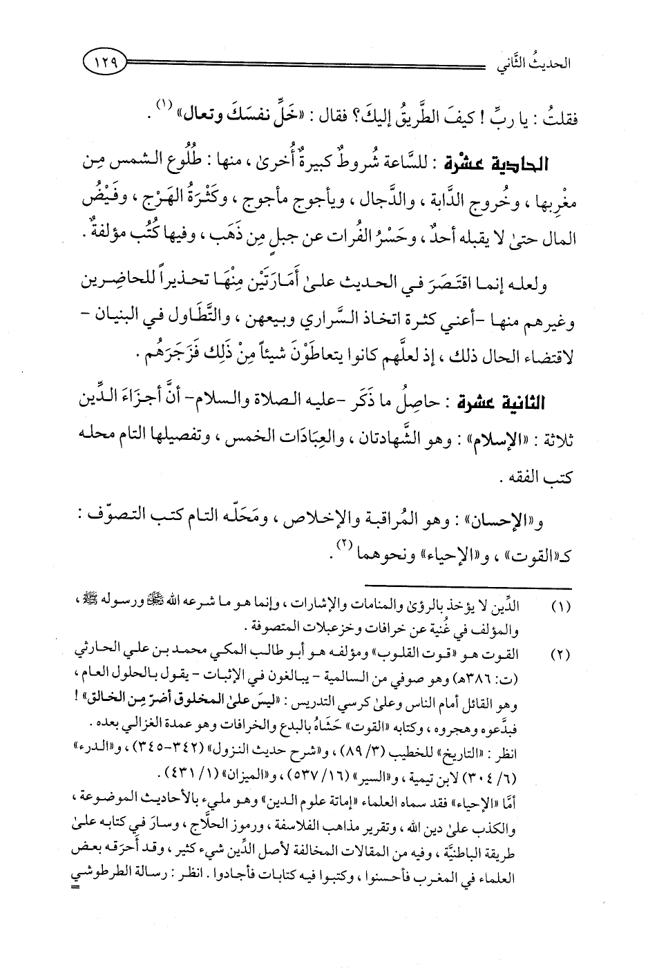 و"الإحسان": وهو المُراقبة والإخلاص، ومَحَلّه التام كتب التصوّف: كـ "القوت"، و"الإحياء" ونحوهما (¬2).