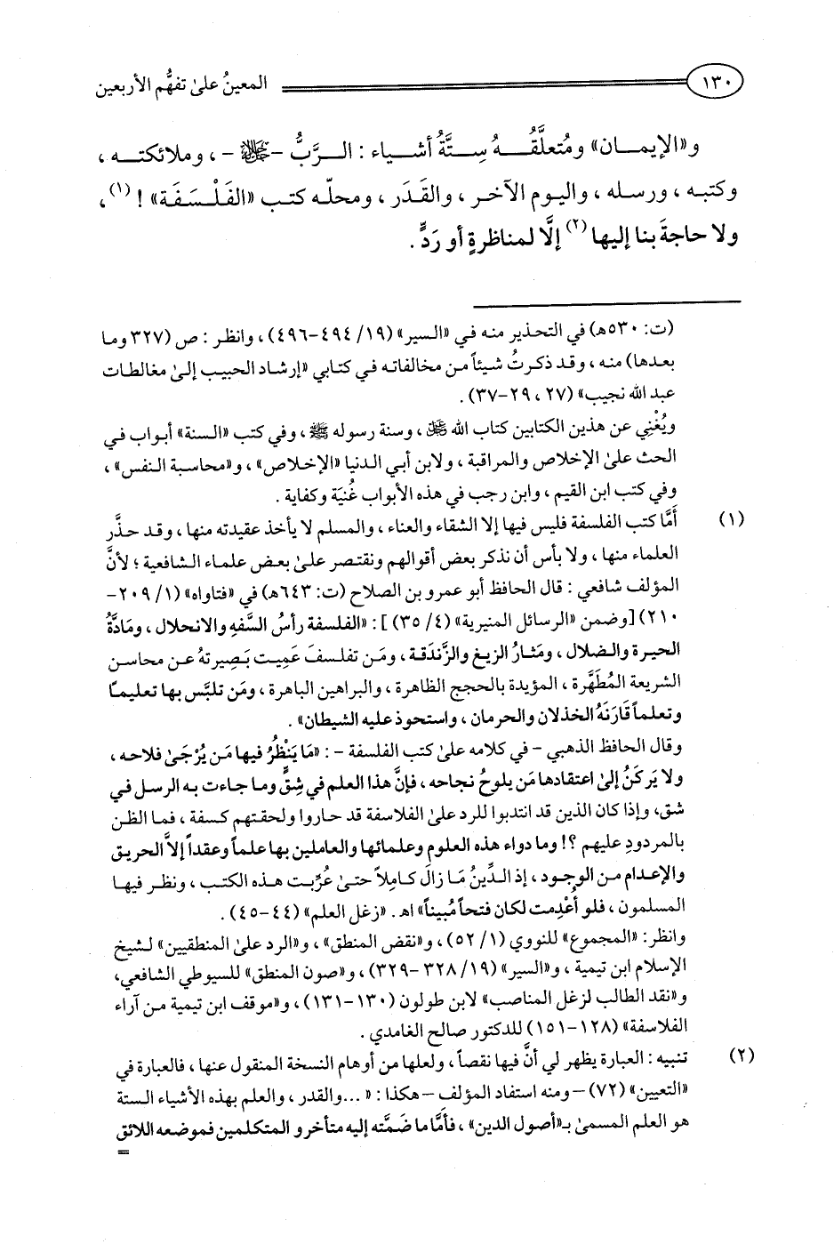 (¬1) أَما كتب الفلسفة فليس فيها إلا الشقاء والعناء، والمسلم لا يأخذ عقيدته منها، وقد حذَّر العلماء منها، ولا بأس أن نذكر بعض أقوالهم ونقتصر على بعض علماء الشافعية؛ لأن المؤلف شافعي: قال الحافظ أبو عمرو بن الصلاح (ت: 643 هـ) في "فتاواه" (1/ 209 - 210) [وضمن "الرسائل المنيرية" (4/ 35)]: "الفلسفة رأسُ السَّفهِ والانحلال، ومَادَّةُ الحيرة والضلال، ومَثارُ الزيغ والزَّندَقة، ومَن تفلسفَ عَمِيت بَصِيرتهُ عن محاسن الشريعة المُطَهَّرة، المؤيدة بالحجج الظاهرة، والبراهين الباهرة، ومَن تلبَّس بها تعليمًا وتعلمًا قَارَنَهُ الخذلان والحرمان، واستحوذ عليه الشيطان".