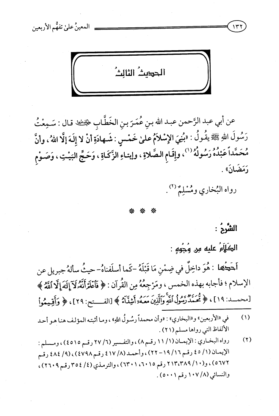 (¬1) في "الأربعين" و"البخاري": "وأن محمدًا رسُولُ اللهِ"، وما أثبته المؤلف هنا هو أحد الألفاظ التي رواها مسلم (21).