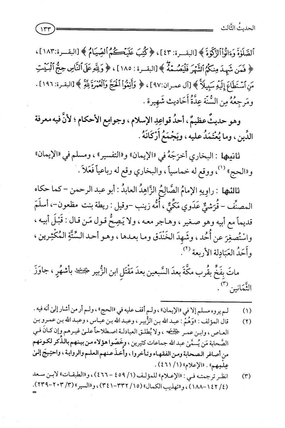 ثالثها: راوِيهِ الإمامُ الصَّالِحُ الزَّاهِدُ العابدُ: أبو عبد الرحمن -كما حكاه المصنِّف- قُرَشيّ عَدَوي مَكِّيٌّ، أُمُّه زينب -وقيل: ريطة بنت مظعون-، أسلَمَ قديمًا مع أبيه وهو صغير، وهاجر معه، ولا يَصِحُّ قول مَن قال: قَبْلَ أبيه، واسْتُصغِرَ عن أُحُد، وشَهِدَ الخَنْدَق وما بعدها، وهو أحد السِّتَّةِ المُكْثِرين، وأَحَدُ العَبَادِلة الأربعة (¬2).