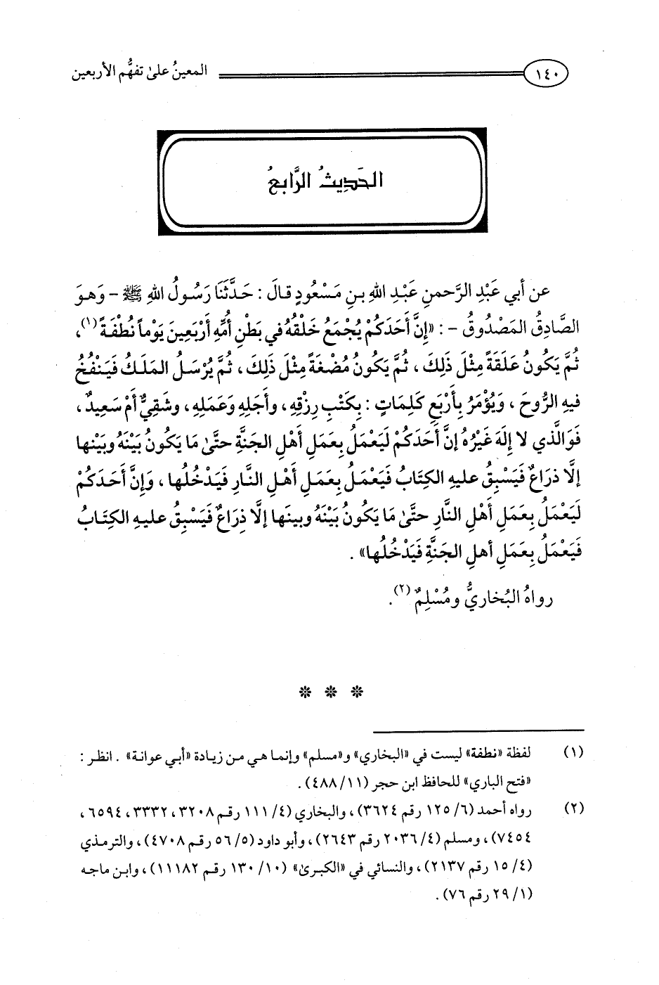 عن أبي عَبْدِ الرَّحمنِ عَبْدِ اللهِ بنِ مَسْعُود قالَ: حَدَّثنا رَسُولُ اللهِ - صلى الله عليه وسلم - وَهوَ الصَّادِقُ المَصْدُوقُ-: "إِن أَحَدَكمْ يُجْمَعُ خَلْقُهُ في بَطْنِ أُمِّهِ أَرْبَعِينَ يَوْما نُطْفَةً (¬1)، ثُمَّ يَكُونُ عَلَقَةً مِثْلَ ذَلِكَ، ثُمَّ يَكُونُ مُضْغَةً مِثْلَ ذَلِكَ، ثُمَّ يُرسَلُ المَلَكُ فَيَنْفُخُ فيهِ الرّوحَ، وَيُؤْمَرُ بِأَرْبعِ كلِمَاتٍ: بِكَتْبِ رِزْقِهِ، وأَجَلِهِ وَعَمَلِهِ، وشَقِيٌّ أَمْ سَعِيدٌ، فَوَالَّذي لا إِلَهَ غيْرُهُ إنَّ أَحَدَكُمْ لَيَعْمَلُ بِعَمَلِ أَهْلِ الجَنةِ حتَّى مَا يَكُونُ بَيْنَهُ وبَيْنها إلَّا ذرَاعٌ فَيَسْبِقُ عليهِ الكِتَابُ فَيَعْمَلُ بِعَمَلِ أَهْلِ النارِ فَيَدْخُلُها، وَإِنَّ أَحَدَكُمْ لَيَعْمَلُ بِعَمَلِ أَهْلِ النَّارِ حتَّى مَا يَكُونُ بَيْنَهُ وبينَها إلَّا ذِرَاعٌ فَيَسْبِقُ عليهِ الكِتَابُ فَيَعْمَلُ بِعَمَلِ أهلِ الجَنَّةِ فَيَدْخُلُها".