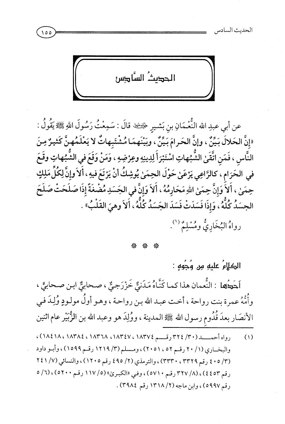 عن أبي عبدِ الله النُّعْمَانِ بنِ بَشيرٍ - رضي الله عنه - قالَ: سَمِعْتُ رَسُولَ اللهِ - صلى الله عليه وسلم - يَقُولُ: "إِنَّ الحَلالَ بَيِّنٌ، وإنَّ الحَرامَ بَيِّنٌ، وبَيْنَهمَا مُشْتَبِهاتٌ لا يَعْلَمُهنَّ كَثيرٌ مِنَ النَّاسِ، فَمَنِ اتَّقَى الشُّبُهاتِ اسْتَبْرَأَ لِدِينِهِ وعِرْضِهِ، وَمَنْ وَقَعَ في الشُّبُهاتِ وقَعَ في الحَرَامِ، كالرَّاعِي يَرْعَى حَوْلَ الحِمَى يُوشِكُ أنْ يَرْتَعَ فيهِ، أَلا وإِنَّ لِكُلِّ مَلِكٍ حِمَى، أَلا وَإِنَّ حِمَى اللهِ مَحَارِمُهُ، أَلا وَإِنَّ في الجَسَدِ مُضْغَةً إِذَا صَلَحَتْ صَلَحَ الجسَدُ كُلُّهُ، وَإِذَا فَسَدَتْ فَسَدَ الجَسَدُ كُلُّهُ، أَلا وهيَ القَلْبُ".