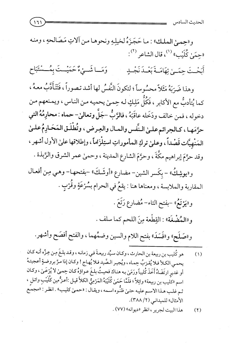 وهذا ضَرَبَهُ مَثَلًا محسُوسًا؛ لتكونَ النَّفسُ لها أشد تصورًا، فَتَتَأَدَّبُ معهُ، كما يُتأدبُّ مع الأكابر، فَكُلُّ مَلِكٍ له حِمى يحميه من الناس، ويمنعهم من دخوله، فمن خالف ودَخَله عاقَبَهُ، فالرَّبُّ -جَلَّ وتعالى- حماه: محارِمُهُ التي حرَّمَها، كالجرائم علي النَّفس والمال والعِرض، وتُطْلَق المَحَارِمُ علي المَنْهِيَّات قَصْدًا، وعلى تركِ المأموراتِ استِلْزَامًا، وإطلاقها علي الأول أشهر، وقد حرَّمَ إبراهيم مكَّةَ، وحرَّمَ الشارع المدينة، وحمى عمر الشرق والرَّبذة.