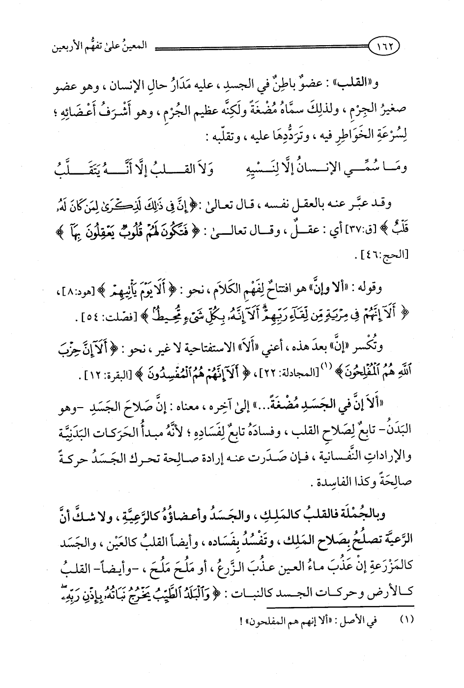 "أَلا إنَّ في الجَسَدِ مُضْغَةً ... " إلى آخِره، معناه: إنَّ صَلاحَ الجَسَدِ -وهو البَدَنُ- تابعٌ لِصَلاحِ القلب، وفسادَهُ تابعٌ لِفَسَادهِ؛ لأنَّهُ مبدأُ الحَرَكات البَدَنِيَّة والإراداتِ النَّفسانية، فإن صَدَرت عنه إرادة صالِحة تحرك الجَسَدُ حركةً صالِحَةً وكذا الفاسِدة.