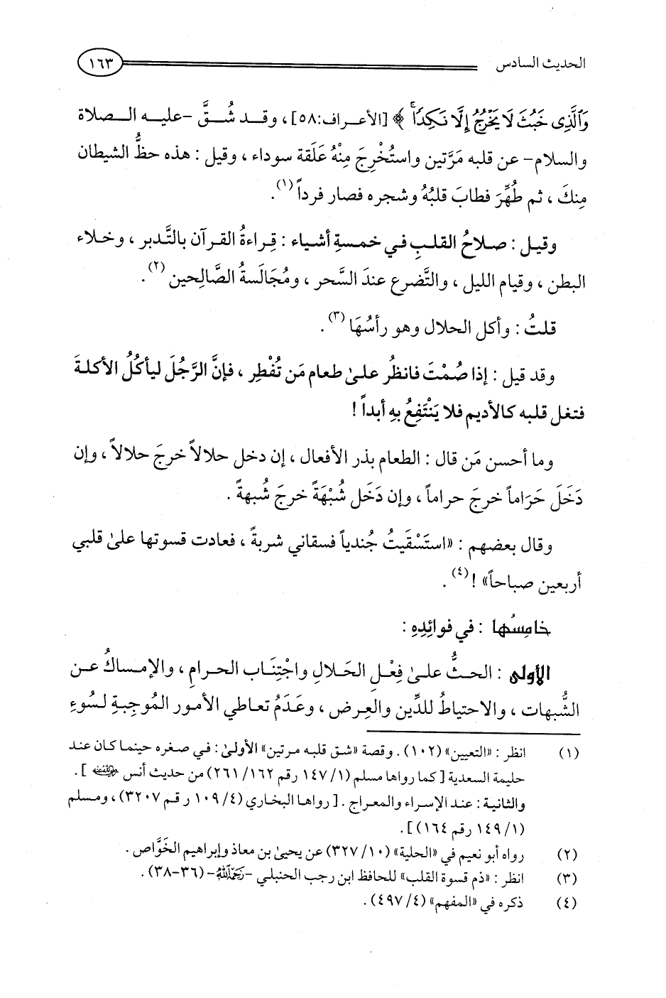 الأولى: الحثُّ علي فِعْلِ الحَلالِ واجْتِنَاب الحرامِ، والإمساكُ عن الشُّبهات، والاحتياطُ للدِّين والعِرض، وعَدَمُ تعاطي الأمور المُوجِبةِ لسُوءِ