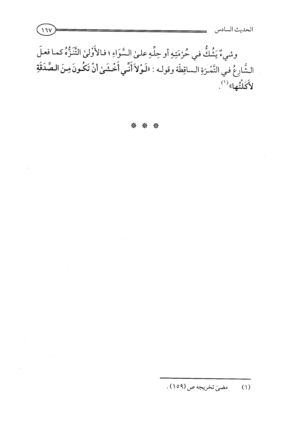 وشيءٌ يَشُكُّ في حُرْمَتِهِ أو حِلِّهِ على السَّوَاءِ؛ فالأَوْلى التَّنَزُّهُ كما فعلَ الشَّارعُ في التَّمْرَةِ الساقِطَة وقوله: "لَوْلَا أَنَّي أَخْشَى أنْ تَكُونَ مِنَ الصَّدَقَةِ لأَكَلْتُها" (¬1).