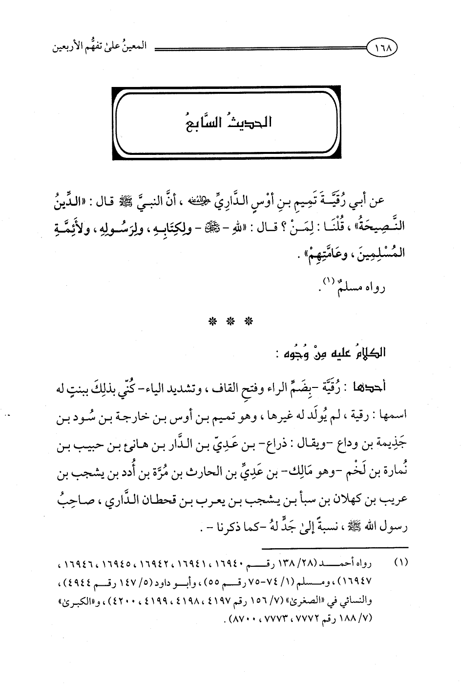 عن أبي رُقيَّةَ تَمِيمِ بنِ أوْسٍ الدَّارِيِّ - رضي الله عنه -، أنَّ النبيَّ - صلى الله عليه وسلم - قال: "الدِّينُ النَّصِيحَةُ"، قُلْنَا: لِمَنْ؟ قال: "للهِ -عزَّ وجلَّ- ولِكِتَابِهِ، ولِرَسُولِهِ، ولأَئِمَّةِ المُسْلِمِينَ، وعَامَّتِهِمْ".