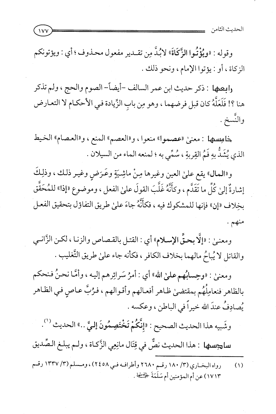 رابعها: ذكر حديث ابن عمر السالف -أيضًا- الصوم والحج، ولم تذكر هنا؟! فَلَعَلَّهُ كان قبل فرضهما، وهو مِن بابِ الزِّيادة في الأحكام لا التعارض والنَّسخ.