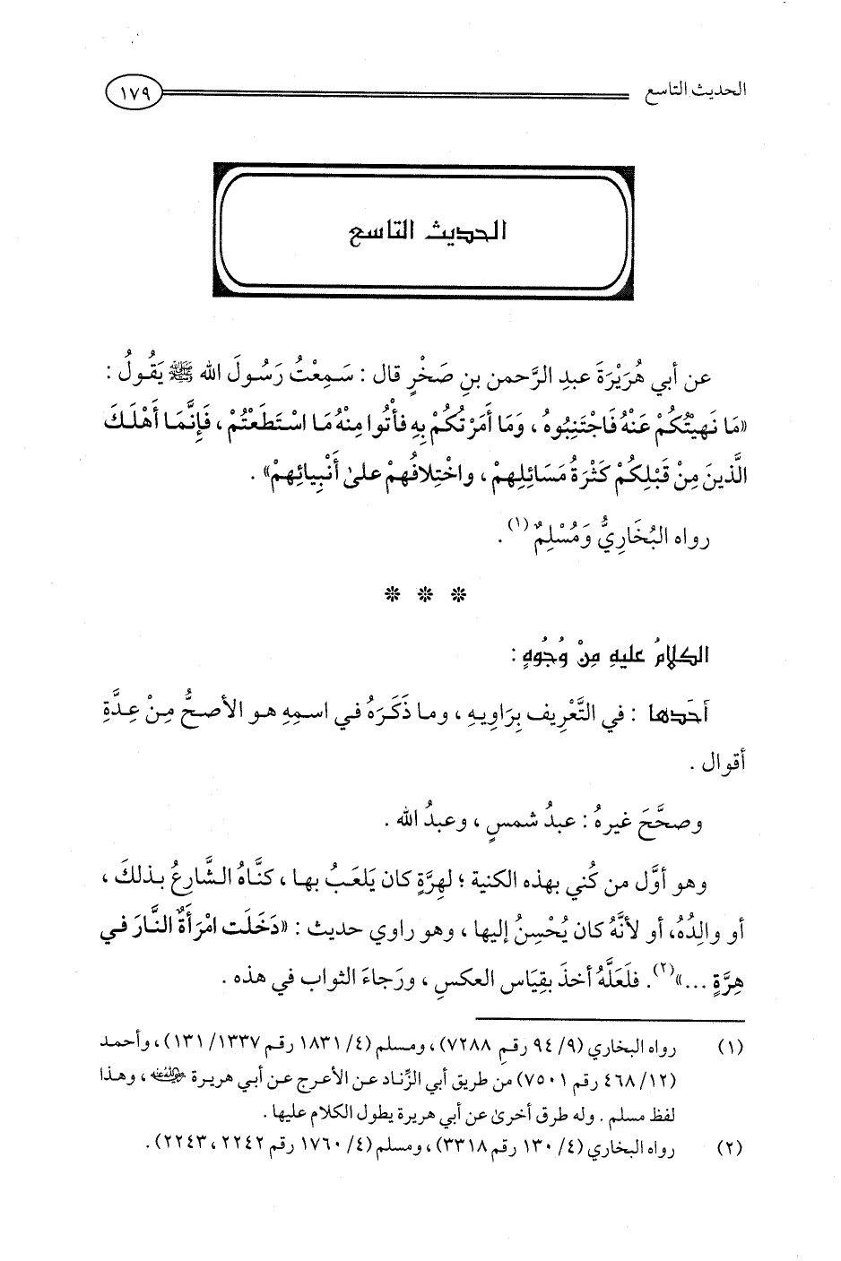 عن أبي هُرَيْرَةَ عبدِ الرَّحمن بنِ صخْرٍ قال: سَمِعْتُ رَسُولَ الله - صلى الله عليه وسلم - يَقُولُ: "مَا نَهيْتُكُمْ عَنْهُ فَاجْتَنِبُوهُ، وَمَا أَمَرْتكُمْ بِهِ فأْتُوا مِنْهُ مَا اسْتَطَعْتُمْ، فَإِنَّمَا أَهْلَكَ الَّذينَ مِنْ قَبْلِكُمْ كَثْرَةُ مَسَائِلِهمْ، واخْتِلافُهمْ على أَنْبِيائِهمْ".