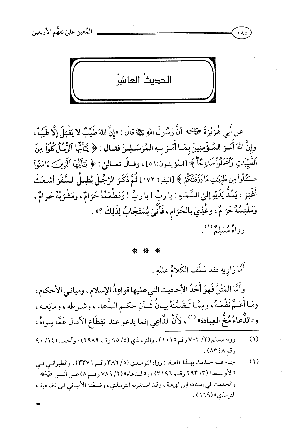 عن أَبي هُرَيْرَةَ - رضي الله عنه - أنَّ رَسُولَ اللهِ - صلى الله عليه وسلم - قالَ: "إِنَّ اللهَ طَيِّبٌ لا يَقْبَلُ إلَّا طَيِّبًا، وإِنَّ اللهَ أَمَرَ المُؤْمِنِينَ بِمَا أَمَرَ بِهِ المُرْسَلِينَ فقال: {يَا أَيُّهَا الرُّسُلُ كُلُوا مِنَ الطَّيِّبَاتِ وَاعْمَلُوا صَالِحًا} [المؤمنون: 51]، وقالَ تعالى: {يَا أَيُّهَا الَّذِينَ آمَنُوا كُلُوا مِنْ طَيِّبَاتِ مَا رَزَقْنَاكُمْ} [البقرة: 172]، ثُمَّ ذَكَرَ الرَّجُلَ يُطِيلُ السَّفَرَ أشعَثَ أَغْبَرَ، يَمُدُّ يَدَيْهِ إلى السَّمَاءِ: يا ربِّ! يا ربِّ! وَمَطْعَمُهُ حَرَامٌ، ومَشْرَبُهُ حَرامٌ، وَمَلْبَسُهُ حَرَامٌ، وغُذِيَ بالحَرَامِ، فَأَنَّى يُسْتَجَابُ لِذَلِكَ؟ ".