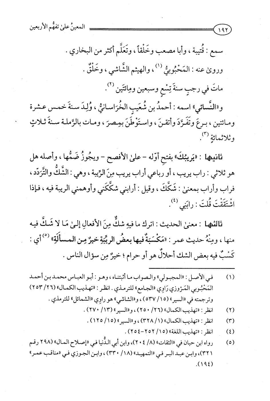 و"النَّسائي" اسمه: أحمدُ بن شُعَيبٍ الخُرَاسانيُّ، وُلِدَ سنةَ خمس عشرة ومائتين، برعَ وتَفَرَّدَ وأتقنَ، واستَوْطَنَ بمِصرَ، ومات بالرَّملة سنةَ ثلاثٍ وثلاثمائةٍ (¬3).