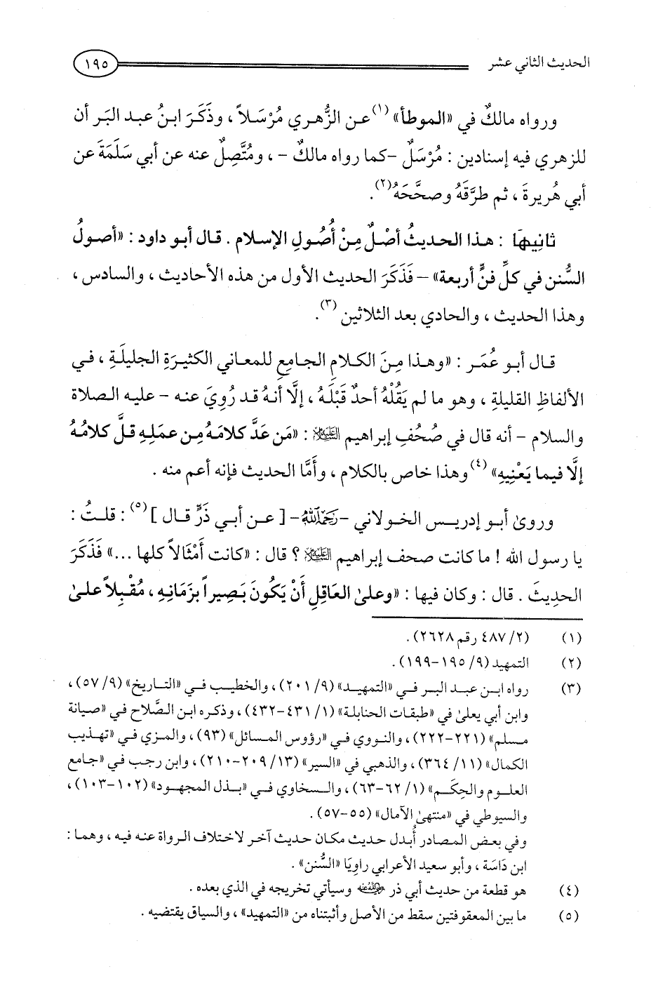 قال أبو عُمَر: "وهذا مِنَ الكلامِ الجامِعِ للمعاني الكثيرَةِ الجليلَةِ، في الألفاظِ القليلةِ، وهو ما لم يَقُلْهُ أحدٌ قَبْلَهُ، إلَّا أنهُ قد رُوِيَ عنه -عليه الصلاة والسلام- أنه قال في صُحُفِ إبراهيم - عليه السلام -: "مَن عَدَّ كلامَهُ مِن عمَلِهِ قلَّ كلامُهُ إلَّا فيما يَعْنِيهِ" (¬4) وهذا خاص بالكلام، وأَمَّا الحديث فإنه أعم منه.