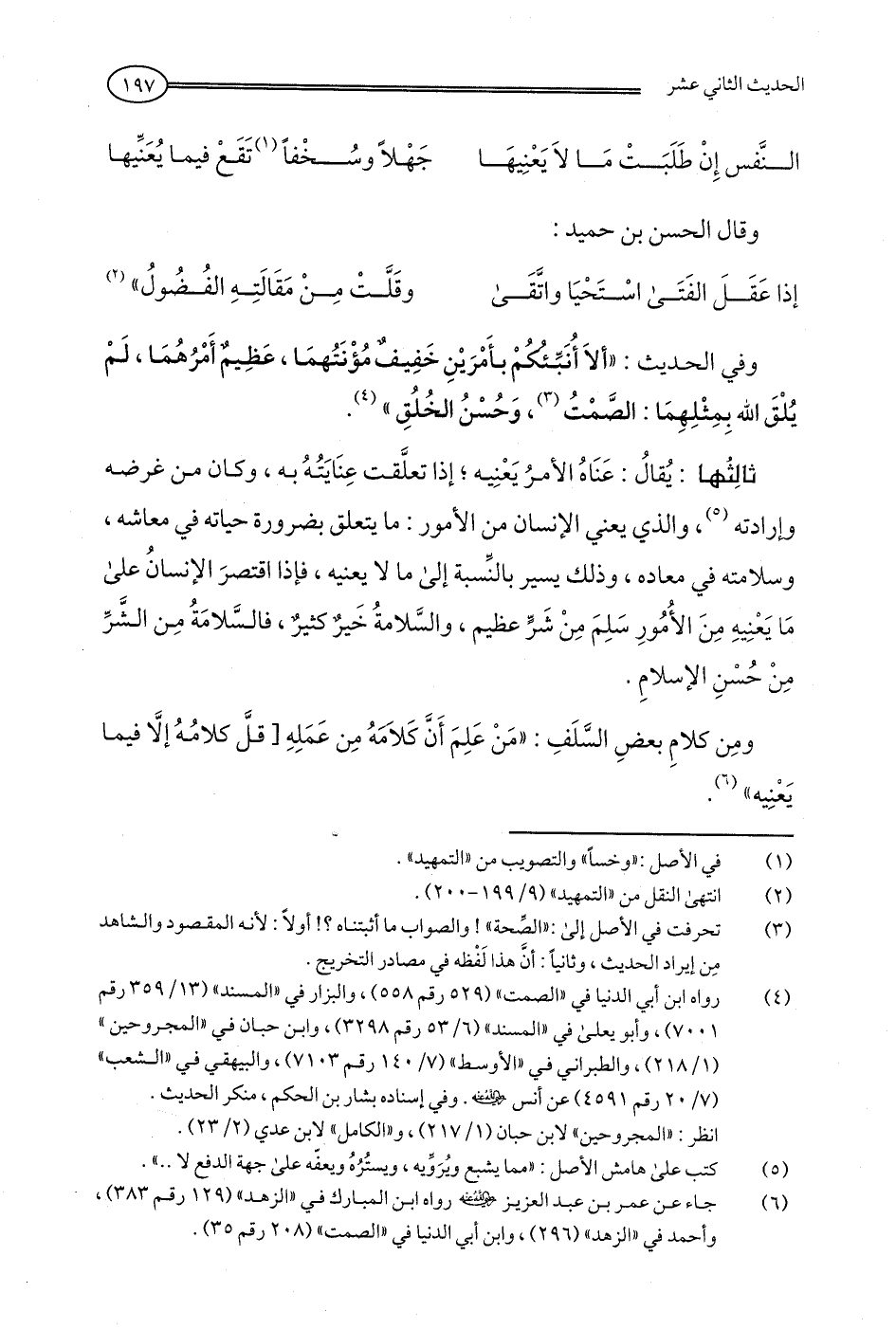 (¬6) جاء عن عمر بن عبد العزيز - رضي الله عنه - رواه ابن المبارك في "الزهد" (129 رقم 383)، وأحمد في "الزهد" (296)، وابن أبي الدنيا في "الصمت" (208 رقم 35).