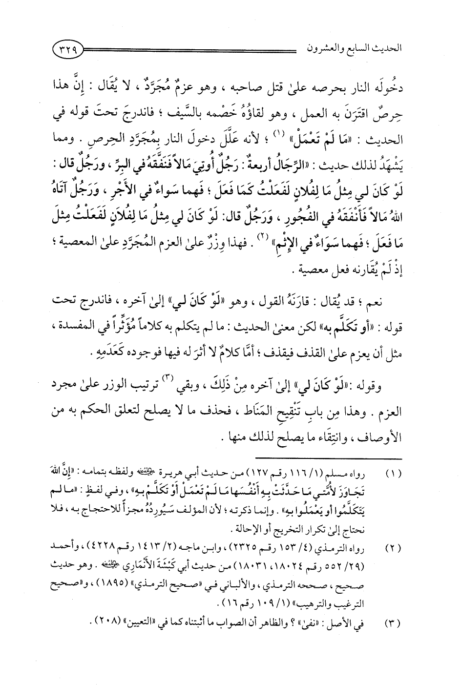 دخُولَه النار بحرصه على قتل صاحبه، وهو عزمٌ مُجَرَّدٌ، لا يُقَال: إِنَّ هذا حِرصٌ اقتَرَنَ به العمل، وهو لقاؤُهُ خَصْمه بالسَّيف، فاندرجَ تحتَ قوله في الحديث: "مَا لَمْ تَعْمَلْ" (¬1)؛ لأنه عَلَّلَ دخولَ النار بمُجَرَّدِ الحِرصِ. ومما يَشْهَدُ لذلك حديث: "الرِّجَالُ أربعةٌ: رَجُل أُوْتِيَ مَالًا فَنَفَّقَهُ في البِرِّ، ورَجُلٌ قال: لَوْ كَانَ لي مِثلُ مَا لِفُلانٍ لَفَعَلْتُ كمَا فَعَلَ؛ فَهما سَواءٌ في الأَجْرِ، وَرَجُلٌ آتَاهُ اللهُ مَالًا فَأَنْفَقَهُ في الفُجُورِ، وَرَجُلٌ قال: لَوْ كَانَ لي مِثلُ مَا لِفُلَانٍ لَفَعَلْتُ مِثلَ مَا فَعَلَ؛ فَهما سَوَاءٌ في الإِثْمِ" (¬2). فهذا وِزْرٌ على العزم المُجَرَّدِ على المعصية، إذْ لَمْ يُقَارنه فعل معصية.