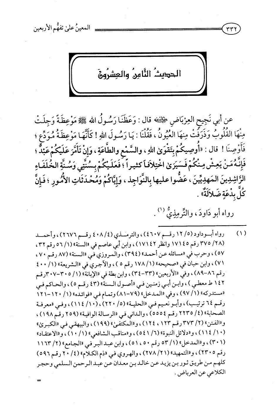 عن أبي نَجِيحٍ العِرْبَاضِ - رضي الله عنه -؛ قال: وَعَظَنَا رَسُولُ الله - صلى الله عليه وسلم - مَوْعِظَةً وَجِلَتْ مِنْهَا القُلُوبُ وَذَرَفتْ مِنهَا العُيُونُ، فَقُلْنَا: يَا رَسُولَ اللهِ! كَأَنَّهَا مَوْعِظَةُ مُوَدِّع؛ فَأَوْصِنَا! قال: "أُوصِيكُمْ بِتَقْوَى اللهِ، والسَّمْعِ والطَّاعَةِ، وَإِنْ تَأَمَّرَ عَلَيكمْ عَبْدٌ؛ فَإِنَّهُ مَنْ يَعِشْ مِنْكُمْ فَسَيَرَى اخْتِلَافًا كَثيرًا؛ فَعَلَيْكُمْ بِسُنَّتِي وَسُنَّةِ الخُلَفَاءِ الرَّاشِدِينَ المَهدِيِّينَ، عَضُّوا عليها بِالنَّوَاجِذ، وَإِيَّاكُمْ وَمُحْدَثَاتِ الأُمُورِ؛ فَإِنَّ كُلَّ بِدْعَةٍ ضَلَالَةٌ".