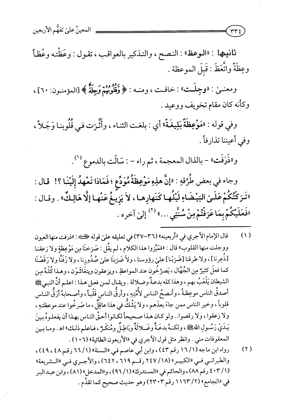 (¬1) قال الإمام الآجري في "أربعينه" (36 - 37) في تعليقه على قوله - رضي الله عنه -: "ذرفت منها العيون ووجلت منها القلوب" قال: "فمَيِّزوا هذا الكلام، لم يقُل: صَرَخنَا مِن مَوْعِظةٍ ولا زعقنا [ذُعِرنا]، ولا طرقنا [ضَرَبْنا] على رؤوسنا، ولَا ضَرَبنَا على صُدُورِنا، ولا زَفَنَّا ولا رَقَصنَا كما فعلَ كثيرٌ مِن الجُهَّال، يَصرُخُون عند المواعظِ، ويزعقون ويتغَاشَوْن، وهذا كُلّهُ مِن الشيطان يَلْعَبُ بهم، وهذا كله بدعةٌ وضلالة. ويتقال لمن فعل هذا: اعلم أنَّ النبي - صلى الله عليه وسلم - أصدقُ الناس موعِظةً، وأنصحُ الناس لأُمَّتِهِ، وأرقُّ الناسِ قَلْبًا، وأصحابهُ أرَقُّ الناس قلوبًا، وخير الناس ممن جاءَ بعدَهم، ولا يَشُك في هذا عاقِل، ما صَرخُوا عند موعظتهِ، ولا زعقوا، ولا رقصوا .. ولو كان هذا صحيحًا لكانوا أحقَّ الناس بهذا أن يفعلوهُ بينَ يَدَيْ رَسُولِ الله - صلى الله عليه وسلم -، ولكنهُ بدعَةٌ وضَلالَةٌ وبَاطِلٌ ومُنكَرٌ، فاعلم ذلك" اهـ. وما بين المعقوفات مني. وانظر مثل قول الآجري في "الأربعون الطائية" (106).
