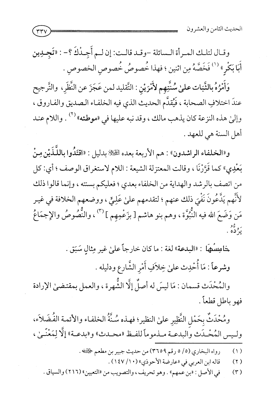 وَأَمْرُهُ بالثَّبَات على سُنَّتِهِم لأَمْرَيْنِ: التَّقليد لمن عَجَزَ عن النَّظَرِ، والتَّرجيح عندَ اختلافِ الصحابة، فَيُقدَّم الحديث الَّذي فيه الخلفاء الصديق والفاروق، وإلى هذه النزعة كان يذهب مالك، وقد نبه عليها في "موطئه" (¬2). واللام عند أهل السنة هي للعهد.