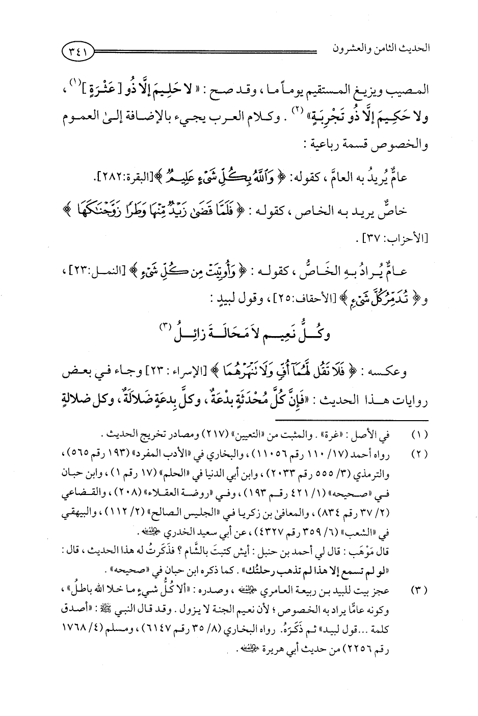 عامٌّ يُرادُ بهِ الخَاصُّ، كقوله: {وَأُوتِيَت مِنْ كُلِّ شَيء} [النمل:23]، {تُدَمِرُ كَلَّ شَيْءٍ] [الأحقاف: 25]، وقول لبيدٍ: