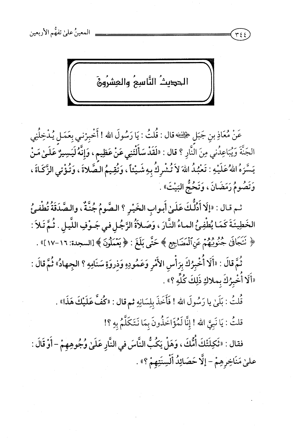 ثمَّ قالَ: "أَلَا أخبِرُكَ بِرَأْسِ الأَمْرِ وَعَمُودِهِ وَذِروَةِ سَنَامِهِ؟ الجِهادُ" ثُمَّ قالَ: "أَلَا أُخْبِرُكَ بِملاكِ ذَلِكَ كُلِّهِ؟ ".