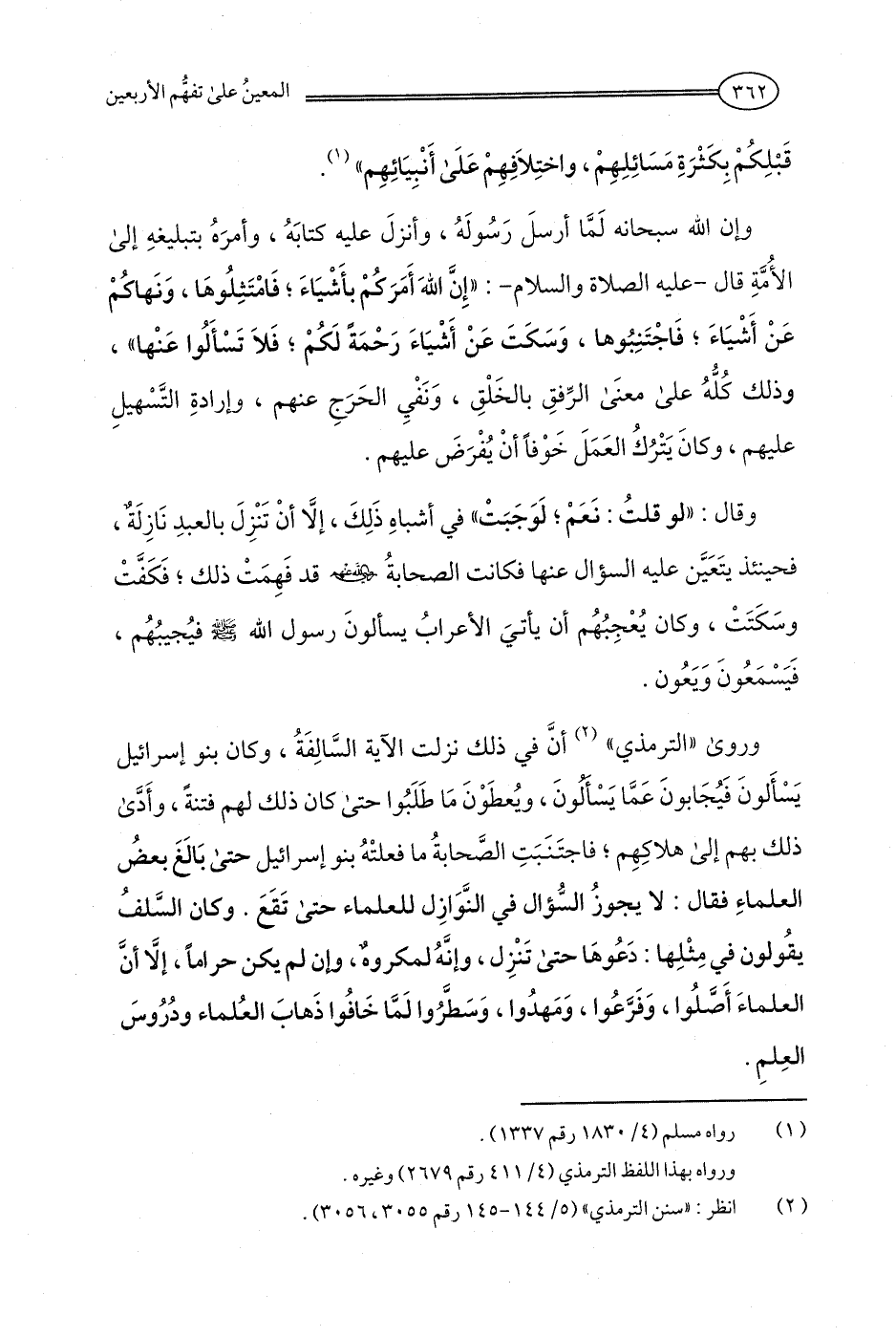 وقال: "لو قلتُ: نَعَمْ، لَوَجَبَتْ" في أشباهِ ذَلِكَ، إلَّا أنْ تَنْزِلَ بالعبدِ نَازِلَةٌ، فحينئذ يتَعَيَّن عليه السؤال عنها فكانت الصحابةُ - رضي الله عنهم - قد فَهِمَتْ ذلك، فَكَفَّتْ وسَكَتَتْ، وكان يُعْجِبُهُم أن يأتيَ الأعرابُ يسألونَ رسول الله - صلى الله عليه وسلم - فيُجيبُهُم، فَيَسْمَعُونَ وَيَعُون.