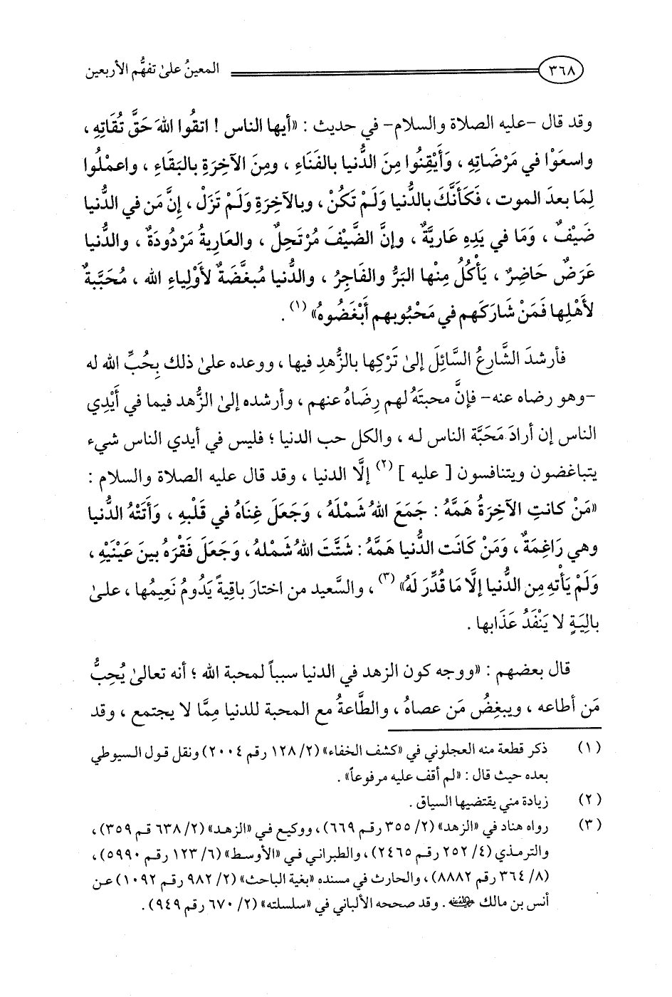 فأرشدَ الشَّارعُ السَّائِلَ إلى تَرْكِها بالزُّهدِ فيها، ووعده على ذلك بِحُبِّ الله له -وهو رضاه عنه- فإنَّ محبتَهُ لهم رِضَاهُ عنهم، وأرشده إلى الزُّهد فيما في أَيْدِي الناس إن أرادَ مَحَبَّة الناس له، والكل حب الدنيا؛ فليس في أيدي الناس شيء يتباغضون ويتنافسون [عليه] (¬2) إلَّا الدنيا، وقد قال عليه الصلاة والسلام: "مَنْ كانتِ الآخِرَةُ هَمَّهُ: جَمَعَ اللهُ شَمْلَهُ، وَجَعَلَ غِنَاهُ في قَلْبهِ، وَأَتَتْهُ الدُّنيا وهي رَاغِمَةٌ، وَمَنْ كانَت الدُّنيا هَمَّهُ: شَتَّتَ اللهُ شَمْلهُ، وَجَعَلَ فَقْرَهُ بينَ عَيْنَيْهِ، وَلَمْ يَأْتهِ مِن الدُّنيا إلَّا مَا قُدِّرَ لَهُ" (¬3)، والسَّعيد من اختارَ باقِيةً يَدُومُ نَعِيمُها، على بالِيَةٍ لا يَنْفَدُ عَذَابها.