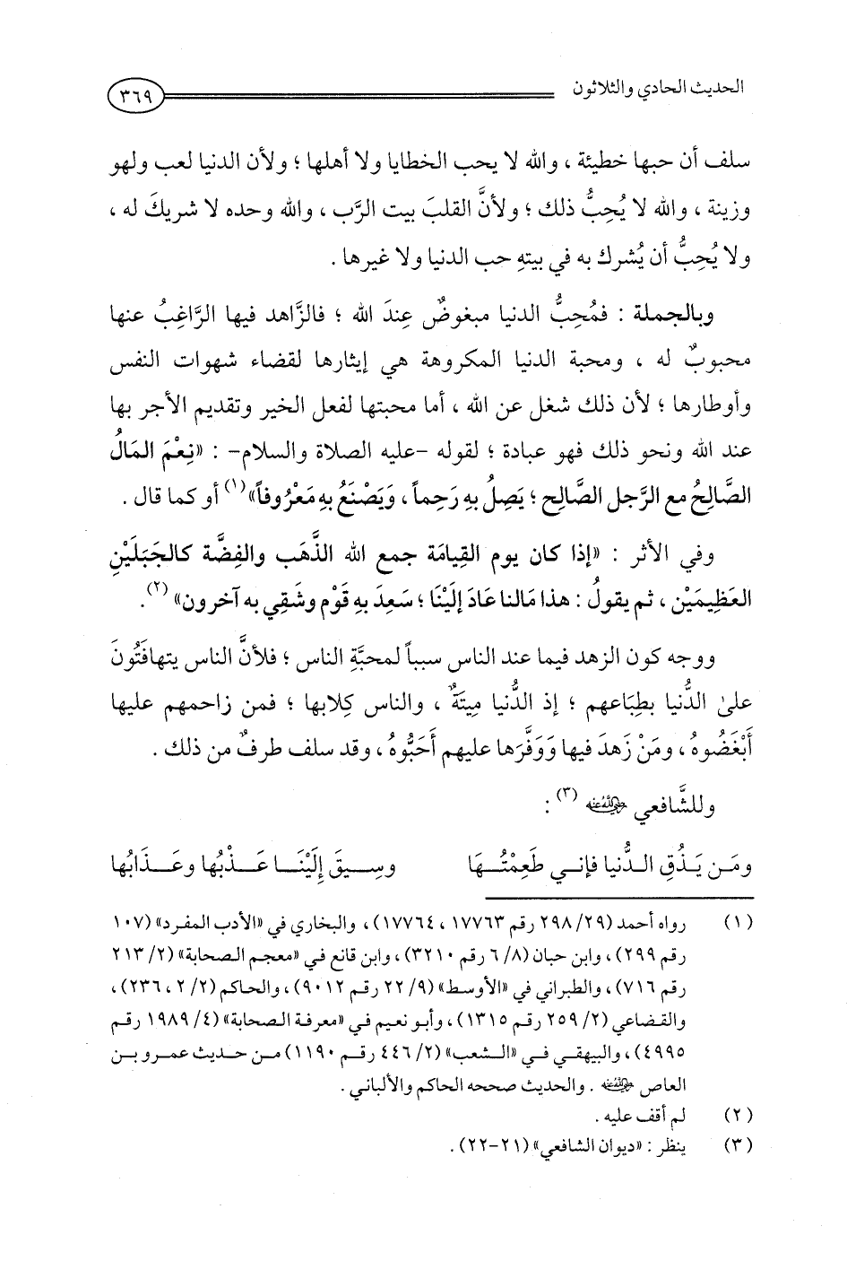 وبالجملة: فمُحِبُّ الدنيا مبغوضٌ عِندَ الله؛ فالزَّاهد فيها الرَّاغِبُ عنها محبوبٌ له، ومحبة الدنيا المكروهة هي إيثارها لقضاء شهوات النفس وأوطارها؛ لأن ذلك شغل عن الله، أما محبتها لفعل الخير وتقديم الأجر بها عند الله ونحو ذلك فهو عبادة؛ لقوله -عليه الصلاة والسلام-: "نِعْمَ المَالُ الصَّالِحُ مع الرَّجل الصَّالِح، يَصِلُ بهِ رَحِمًا، وَيَصْنعُ بهِ مَعْرُوفًا" (¬1) أو كما قال.