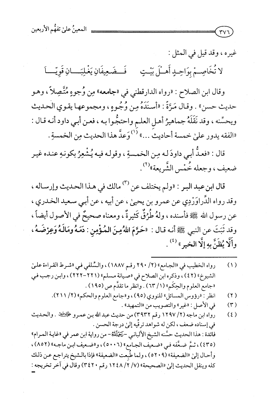 وقال ابن الصلاح: "رواه الدارقطني في "جامعه" مِن وُجوهٍ مُتَّصِلًا، وهو حديث حسن". وقال مَرَّةً: "أسنَدَهُ مِن وُجُوهٍ، ومجموعها يقوي الحديث ويحسِّنه، وقد نَقَلَهُ جماهيرُ أهلِ العلمِ واحتجُّوا به، فعن أبي داود أنه قال: "الفقه يدور على خمسة أحاديث ... " (¬1) وَعدَّ هذا الحديث مِن الخمسةِ.