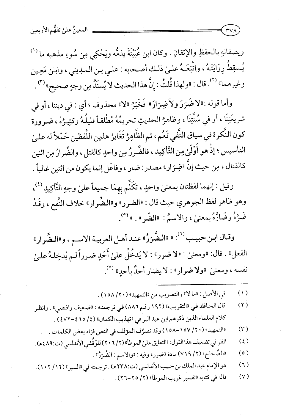وقال ابن حبيب (¬6): ""الضَّرَرُ" عند أهل العربية الاسم، و"الضِّرار" الفعل". قال: "ومعنى: "لا ضرر": لا يَدخُلُ على أَحَدٍ ضررًا لم يُدخِلهُ على نفسه، ومعنى "ولا ضرار": لا يضار أحدٌ بأحدٍ" (¬7).