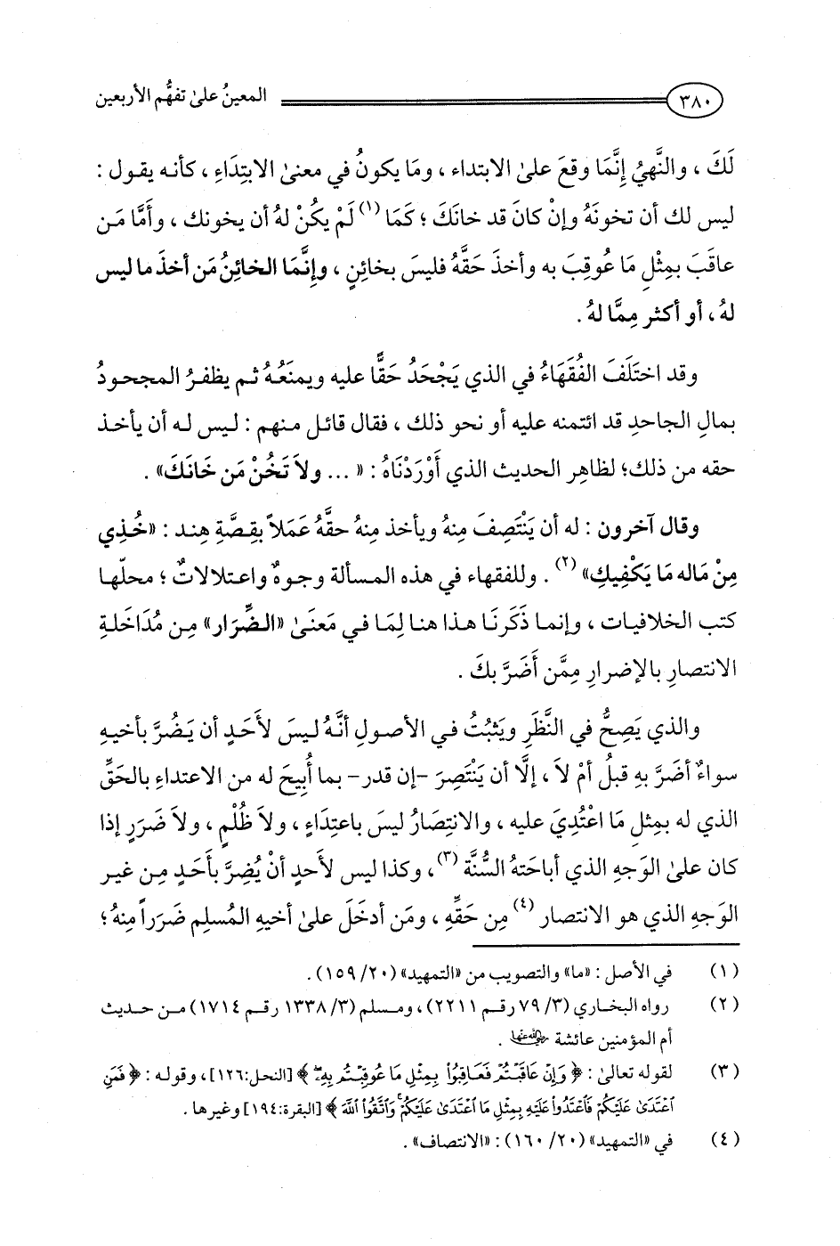وقال آخرون: له أن يَنْتَصِفَ مِنهُ ويأخذ مِنهُ حقَّهُ عَمَلًا بقِصَّةِ هِند: "خُذِي مِنْ مَاله مَا يَكْفِيكِ" (¬2). وللفقهاء في هذه المسألة وجوهٌ واعتلالاتٌ؛ محلّها كتب الخلافيات، وإنما ذَكَرنَا هذا هنا لِمَا في مَعنَى "الضِّرَار" مِن مُدَاخَلةِ الانتصارِ بالإضرارِ مِمَّن أَضَرَّ بكَ.