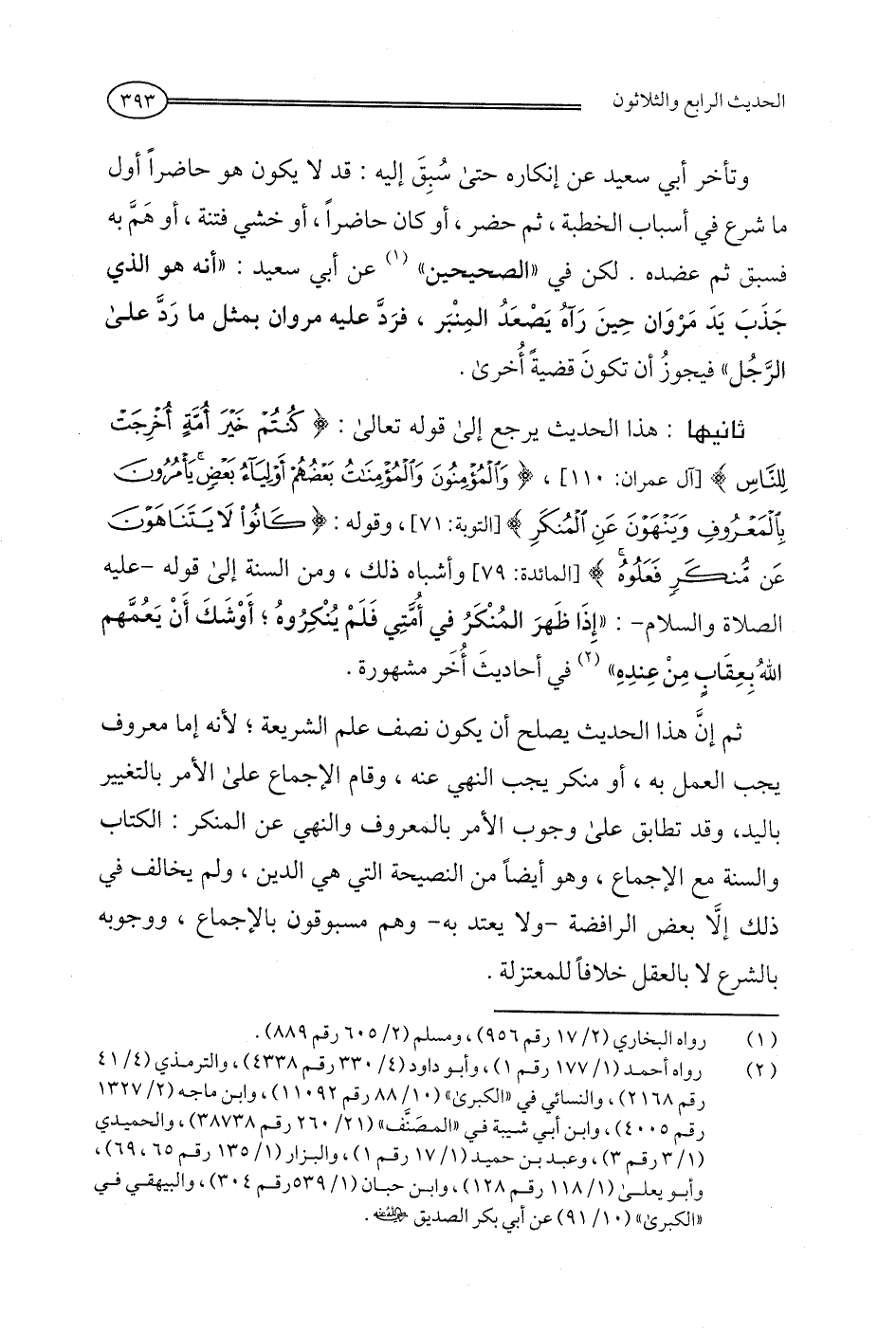 ثانيها: هذا الحديث يرجع إلى قوله تعالى: {كُنْتُمْ خَيْرَ أُمَّةٍ أُخْرِجَتْ لِلنَّاسِ} [آل عمران: 110]، {وَالْمُؤْمِنُونَ وَالْمُؤْمِنَاتُ بَعْضُهُمْ أَوْلِيَاءُ بَعْضٍ يَأْمُرُونَ بِالْمَعْرُوفِ وَيَنْهَوْنَ عَنِ الْمُنْكَرِ} [التوبة: 71]، وقوله: {كَانُوا لَا يَتَنَاهَوْنَ عَنْ مُنْكَرٍ فَعَلُوهُ} [المائدة: 79] وأشباه ذلك، ومن السنة إلى قوله -عليه الصلاة والسلام-: "إِذَا ظَهرَ المُنْكَرُ في أُمَّتِي فَلَمْ يُنْكِرُوهُ؛ أَوْشَكَ أَنْ يَعُمَّهم اللهُ بِعِقَابٍ مِنْ عِندهِ" (¬2) في أَحاديثَ أُخَر مشهورة.