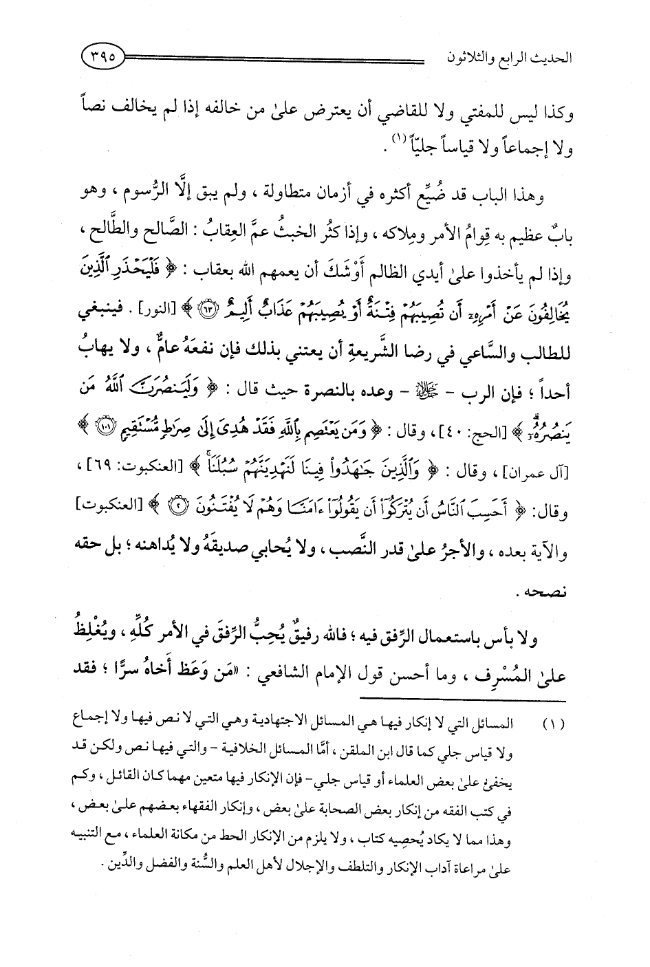 (¬1) المسائل التي لا إنكار فيها هي المسائل الاجتهادية وهي التي لا نص فيها ولا إجماع ولا قياس جلي كما قال ابن الملقن، أمَّا المسائل الخلافية -والتي فيها نص ولكن قد يخفى على بعض العلماء أو قياس جلي- فإن الإنكار فيها متعين مهما كان القائل، وكم في كتب الفقه من إنكار بعض الصحابة على بعض، وإنكار الفقهاء بعضهم على بعض، وهذا مما لا يكاد يُحصِيه كتاب، ولا يلزم من الإنكار الحط من مكانة العلماء، مع التنبيه على مراعاة آداب الإنكار والتلطف والإجلال لأهل العلم والسُّنة والفضل والدِّين.
