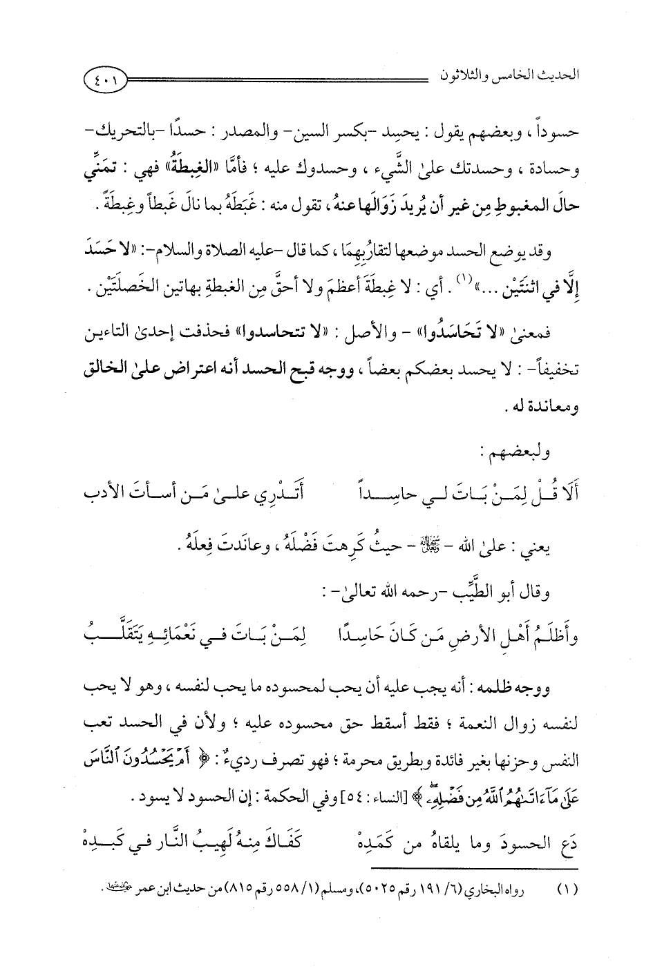 ووجه ظلمه: أنه يجب عليه أن يحب لمحسوده ما يحب لنفسه، وهو لا يحب لنفسه زوال النعمة؛ فقط أسقط حق محسوده عليه؛ ولأن في الحسد تعب النفس وحزنها بغير فائدة وبطريق محرمة؛ فهو تصرف رديء: {أَمْ يَحْسُدُونَ النَّاسَ عَلَى مَا آتَاهُمُ اللَّهُ مِنْ فَضْلِهِ} [النساء: 54] وفي الحكمة: إن الحسود لا يسود.