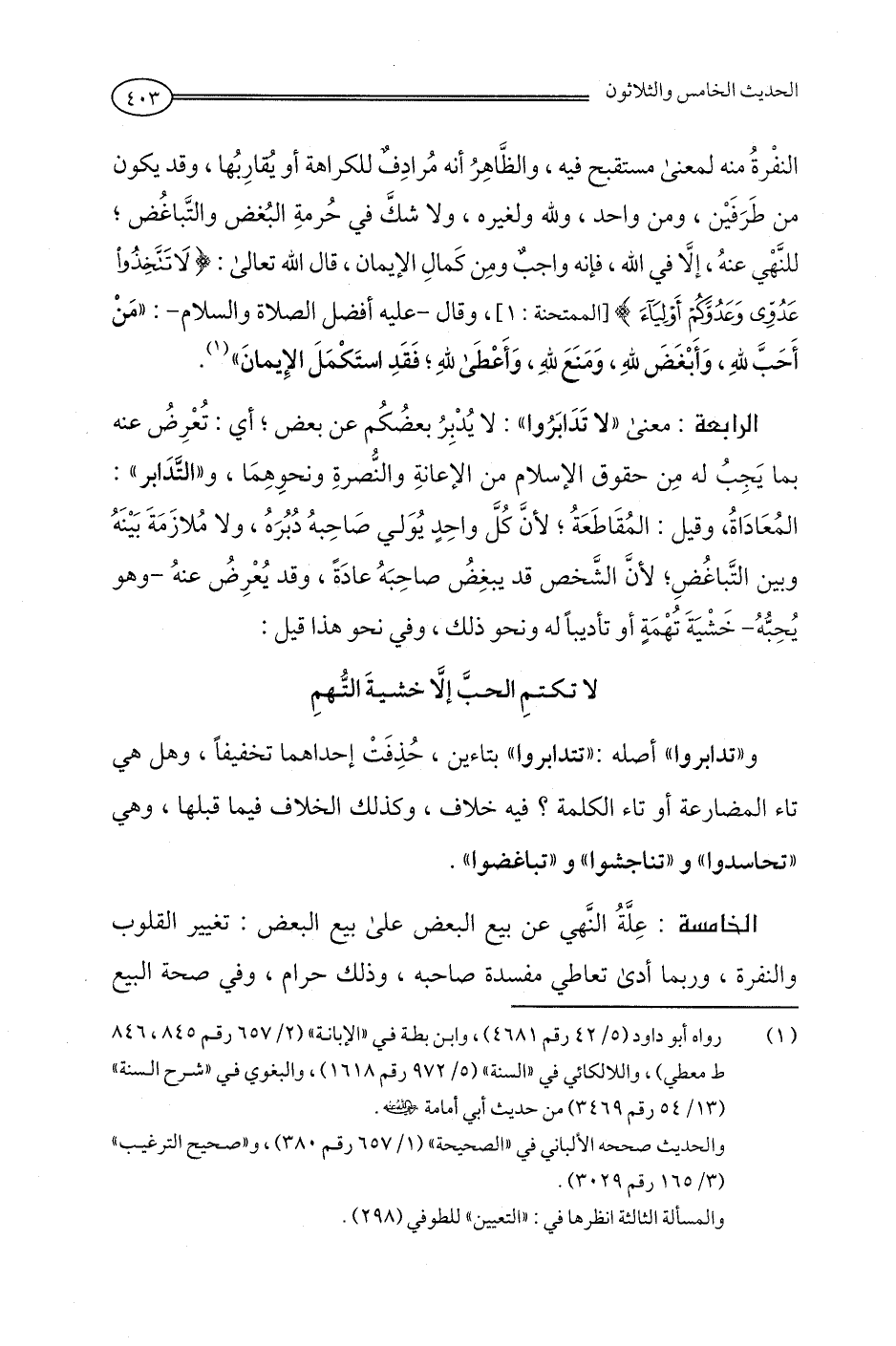 الرابعة: معنى "لا تَدَابَرُوا": لا يُدبِرُ بعضكُم عن بعض، أي: تعرِضُ عنه بما يَجِبُ له مِن حقوق الإسلام من الإعانةِ والنُّصرةِ ونحوِهِمَا، و"التَّدَابر": المُعَادَاةُ، وقيل: المُقَاطَعَةُ، لأنَّ كُل واحِدٍ يُوَلي صَاحِبهُ دُبُرَهُ، ولا مُلازَمَةَ بَيْنَهُ وبين التَّباغُضِ، لأنَّ الشَخص قد يبغِضُ صاحِبَهُ عادَةً، وقد يُعرِضُ عنهُ -وهو يُحِبُّهُ- خَشْيَةَ تُهْمَةٍ أو تأديبًا له ونحو ذلك، وفي نحو هذا قيل: